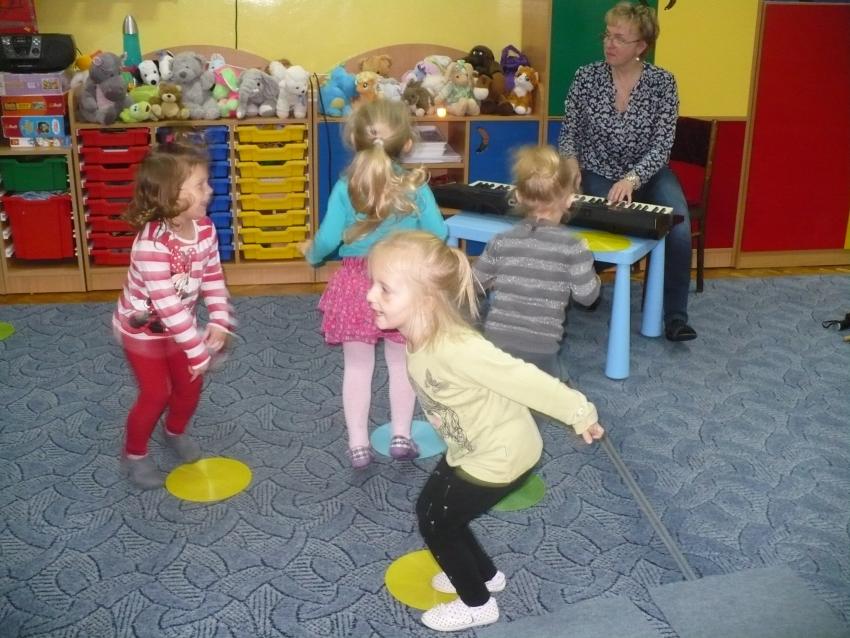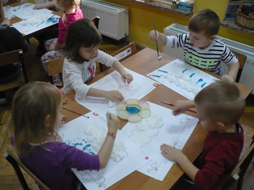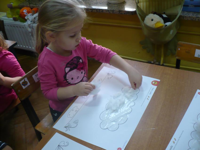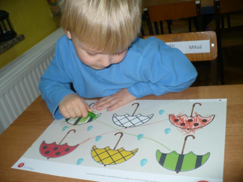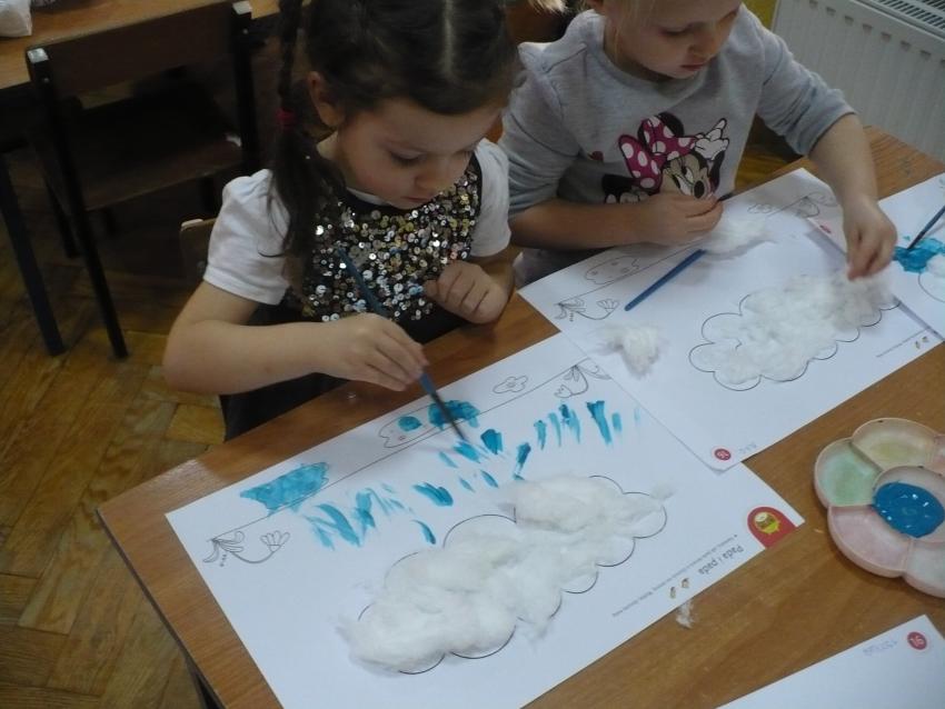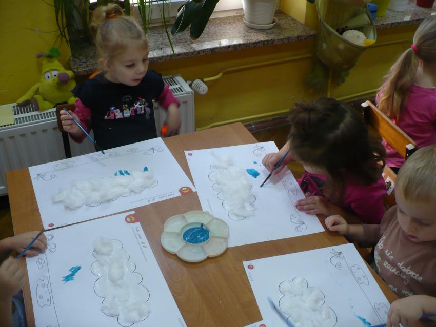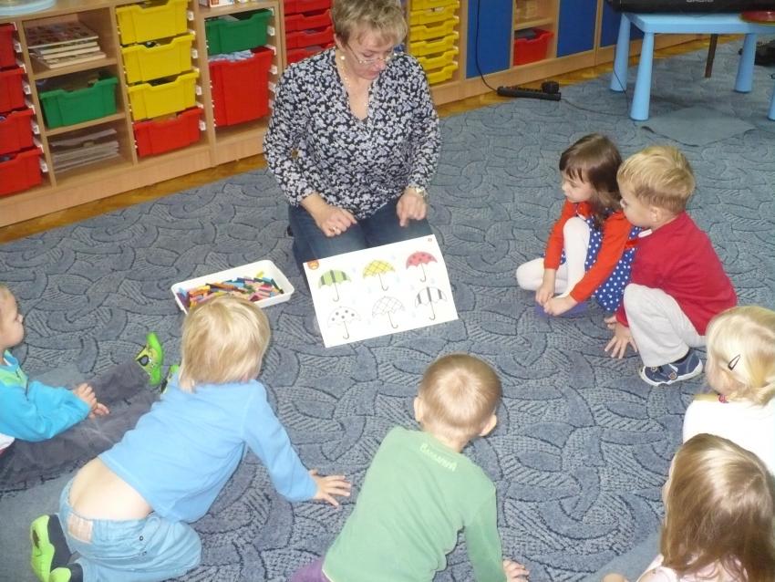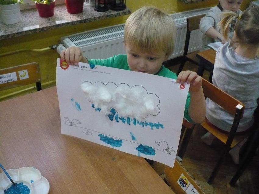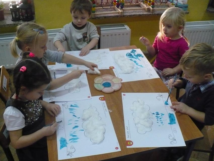 Krasnoludki dowiedziały się, jak powstaje deszcz. Uczyły się, jak prawidłowo posługiwać się parasolem i na sucho bawiły się deszczem, chodziły po kałużach, naśladowały rytm spadających kropelek.