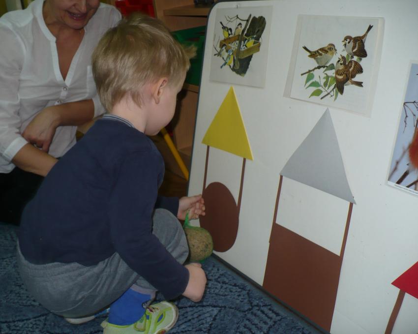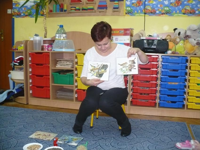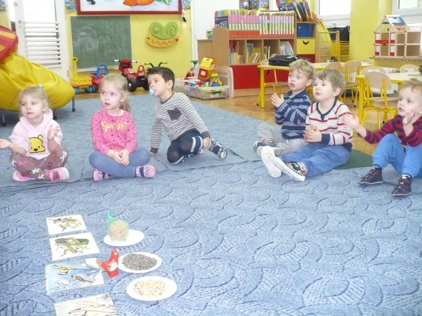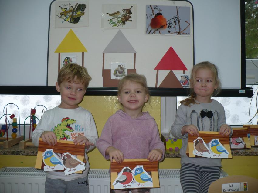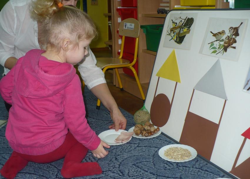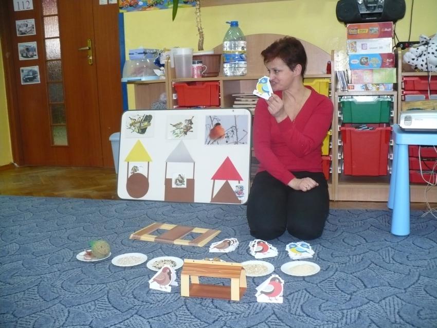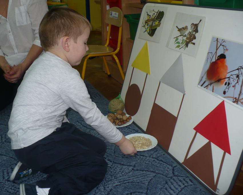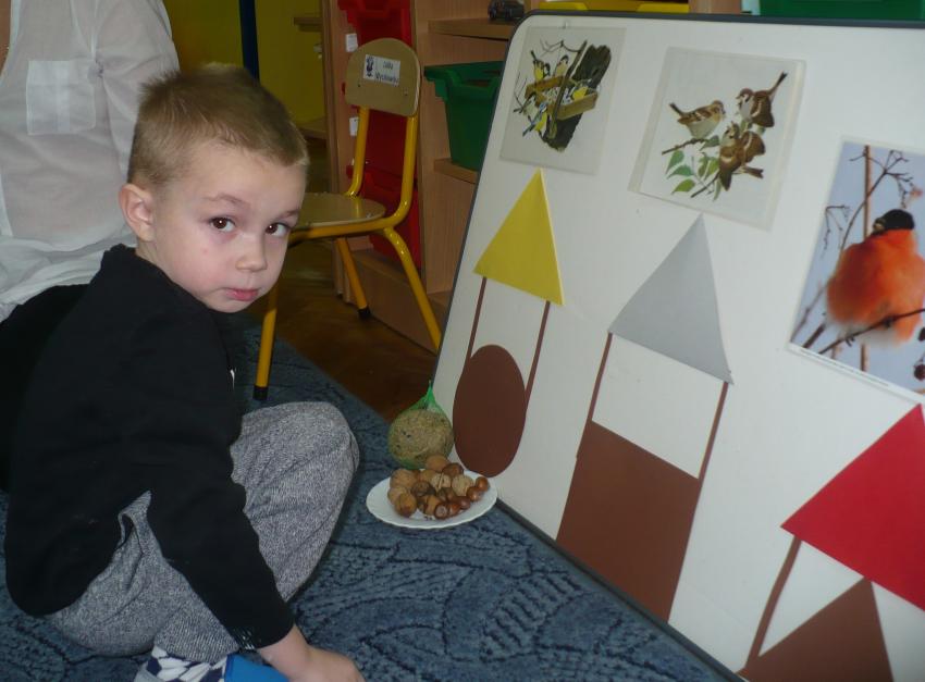 Krasnoludki wiedzą już, że zimą koniecznie trzeba dokarmiać ptaszki - wtedy wiosną podziękują nam pięknym śpiewem. Wiedzą też jakie są ulubione przysmaki wróbelków, sikorek i gili. Przy tej okazji utrwaliły też nazwy figur geometrycznych.