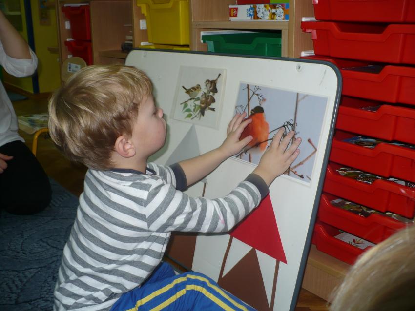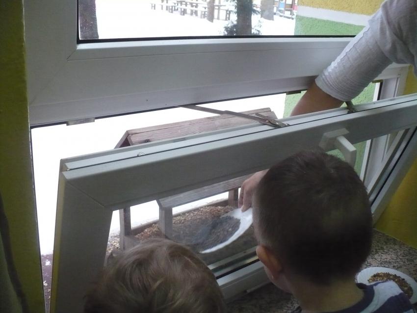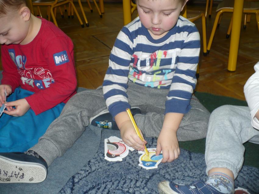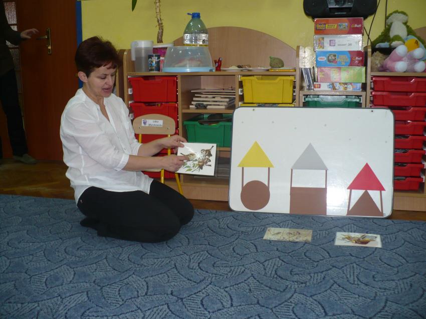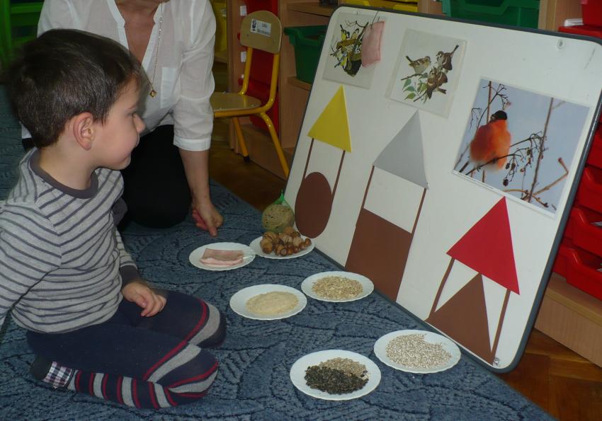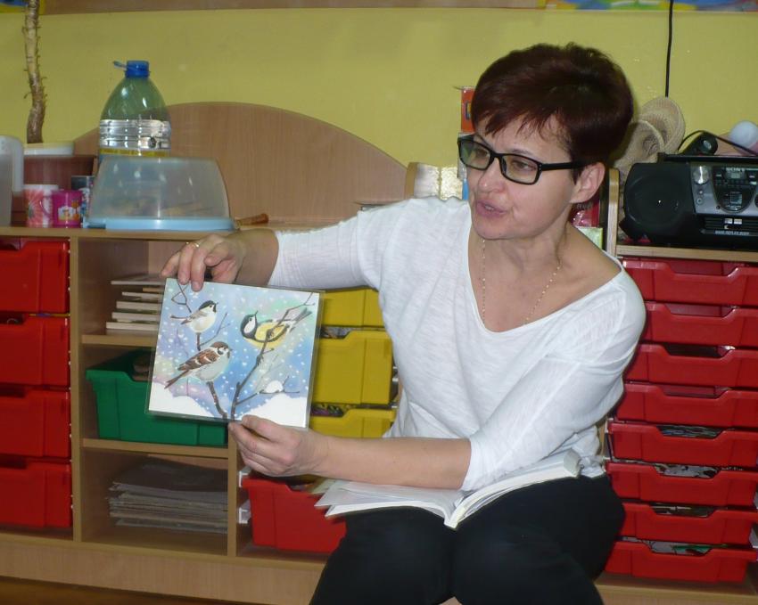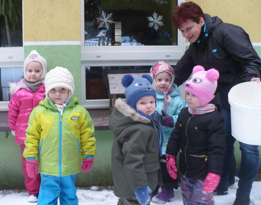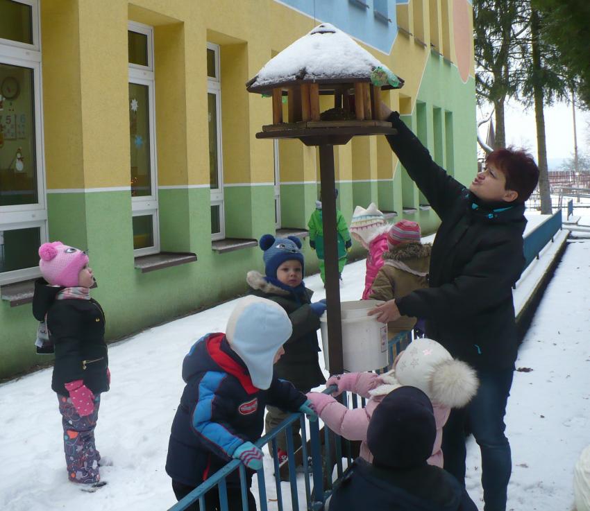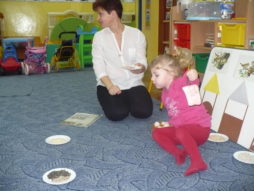 Krasnoludki wiedzą już, że zimą koniecznie trzeba dokarmiać ptaszki - wtedy wiosną podziękują nam pięknym śpiewem. Wiedzą też jakie są ulubione przysmaki wróbelków, sikorek i gili. Przy tej okazji utrwaliły też nazwy figur geometrycznych.