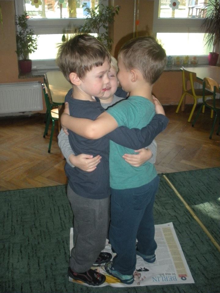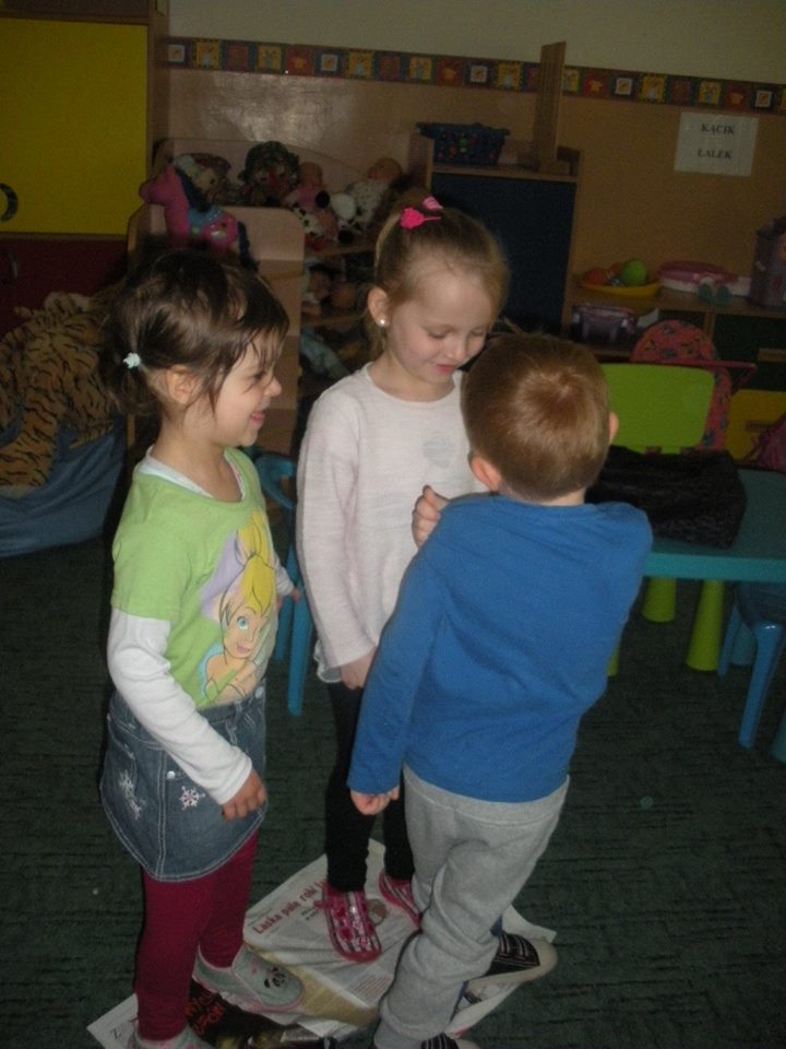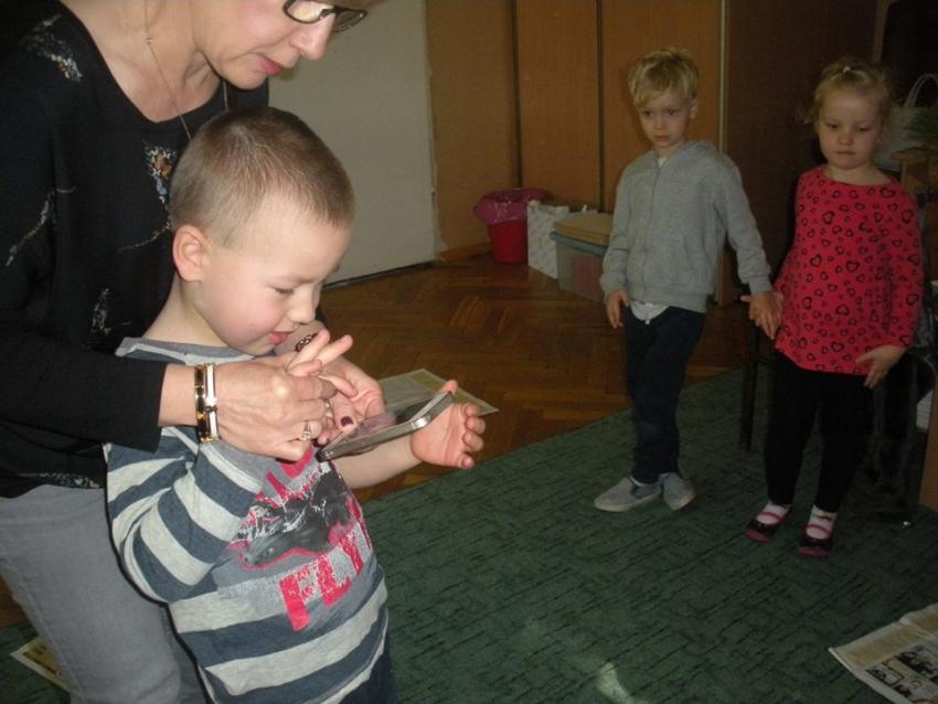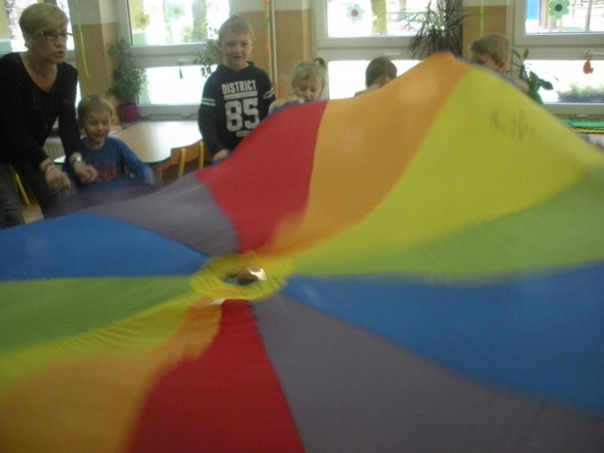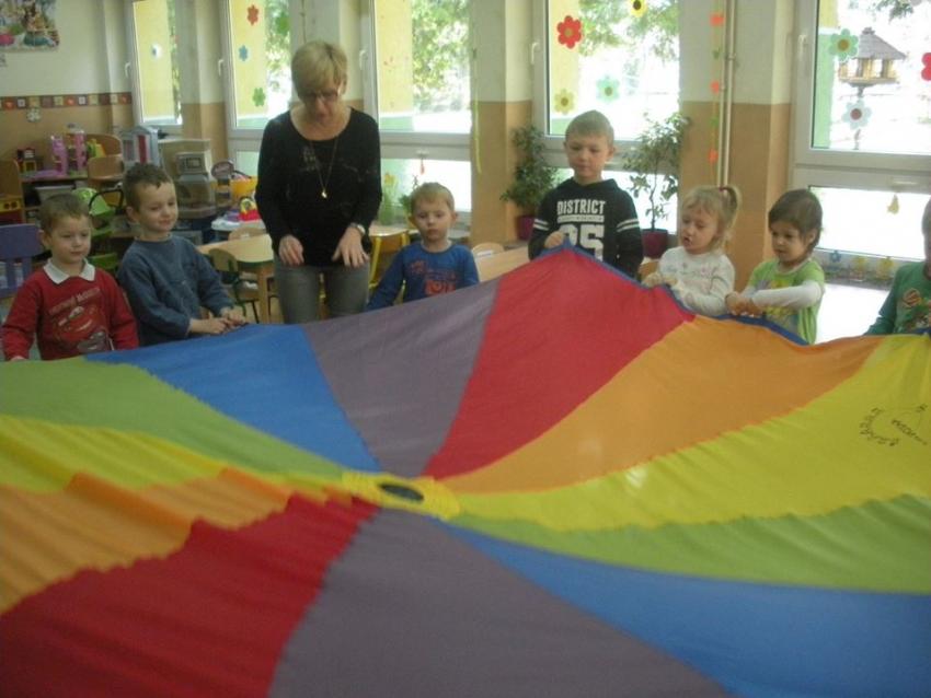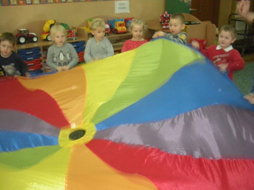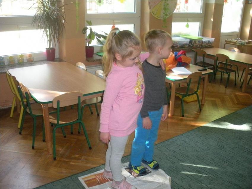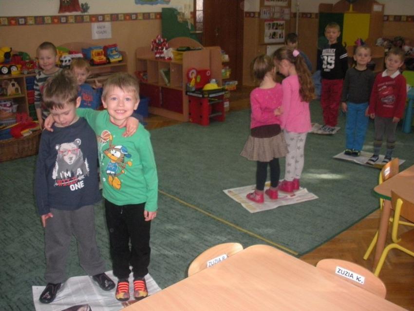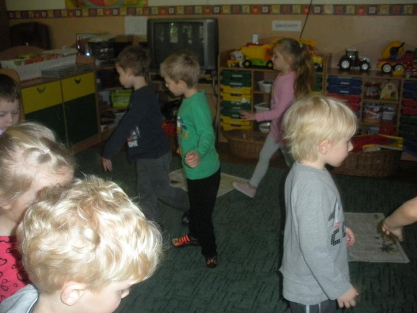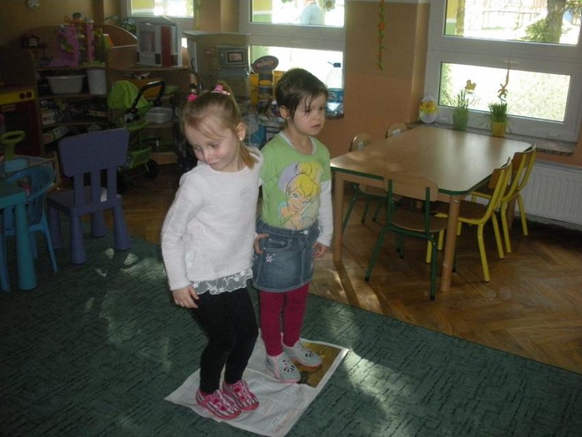 Po zabawie integracyjnej z chustą animacyjną przyszedł czas na zabawę ruchowo – matematyczną: dzieci – marynarze dobierały się w pary lub trójki, aby wyruszyć w rejs swoimi gazetowymi statkami.