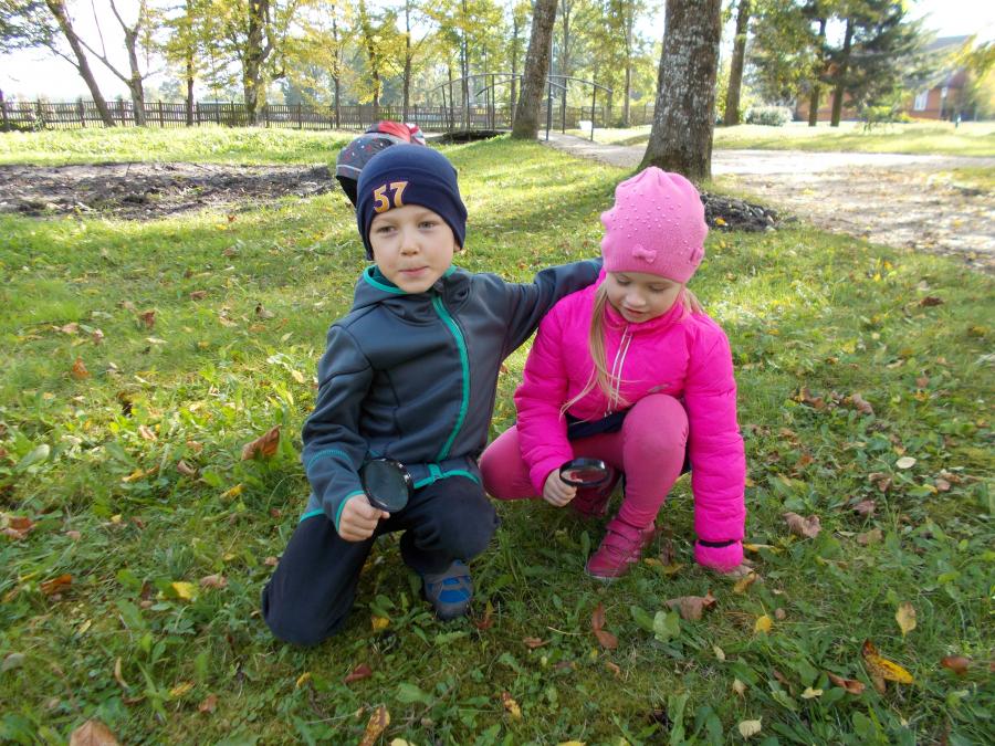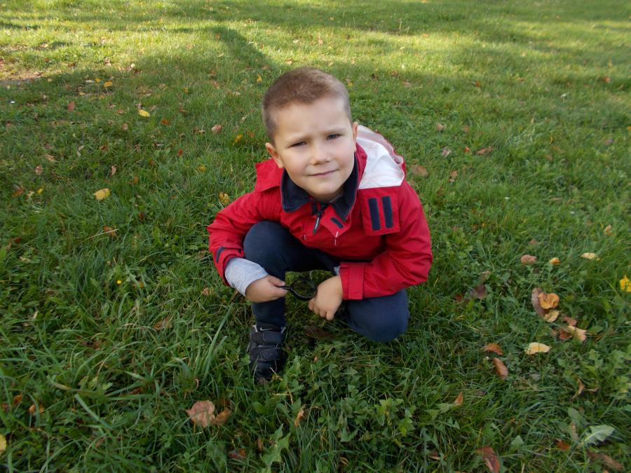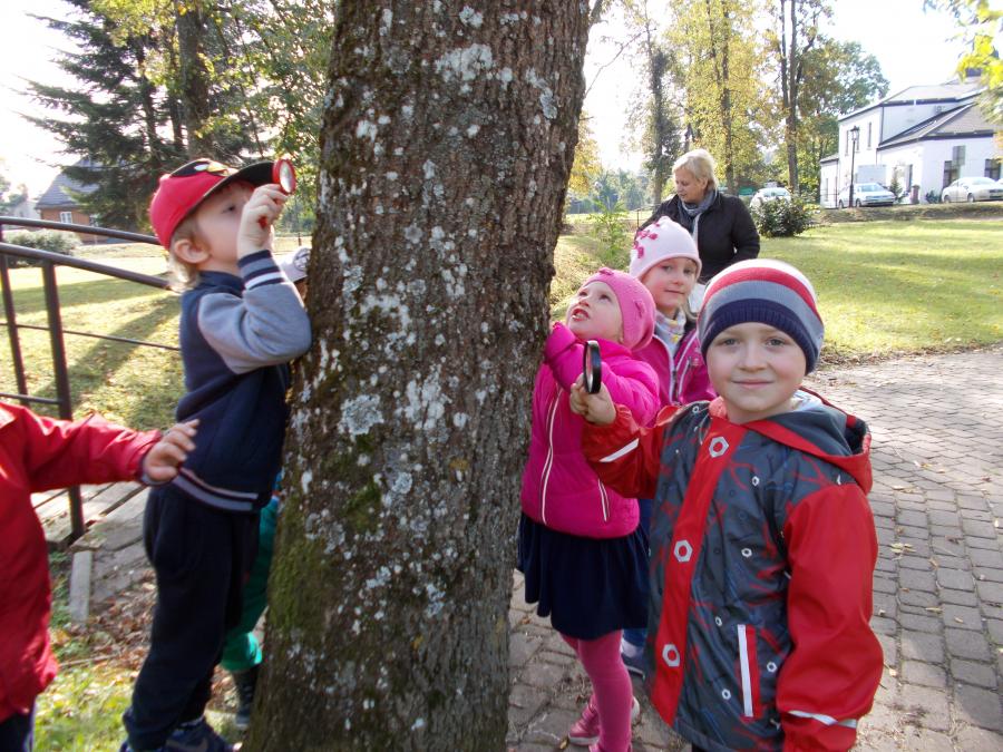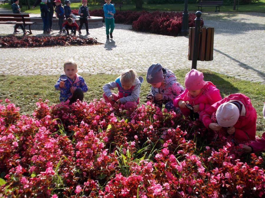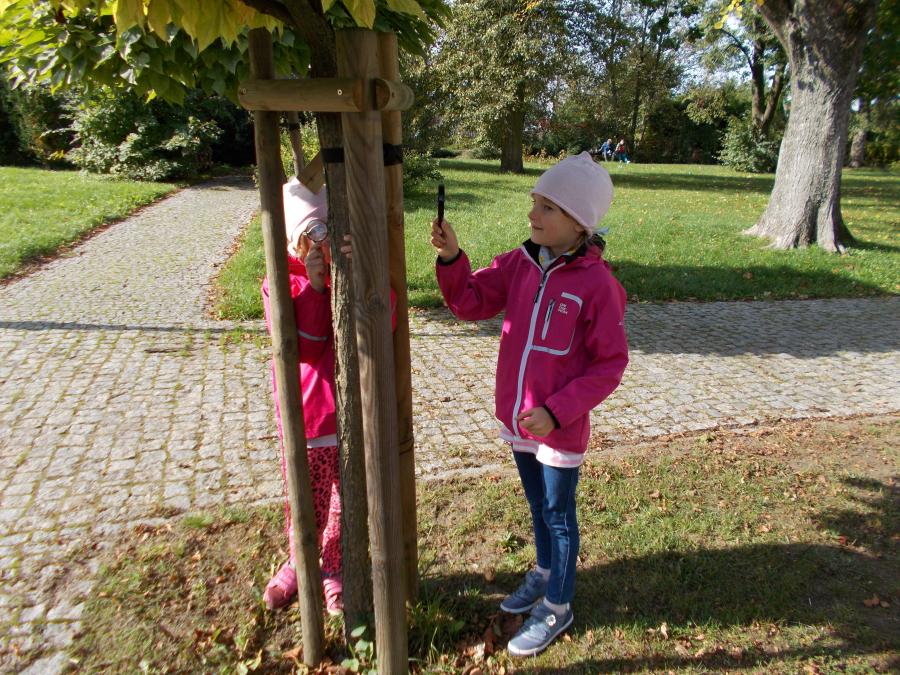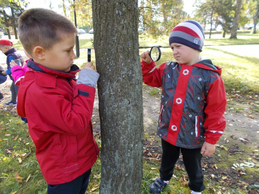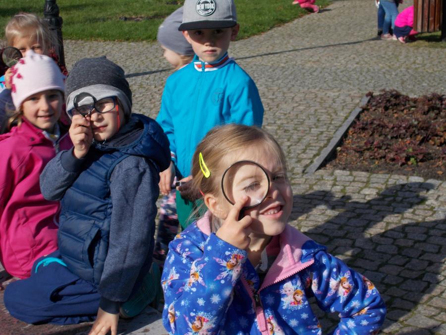 Dzieci obserwują przez lupy dary jesieni w parku, oglądają drzewa i małe owady przygotowujące się do snu zimowego.