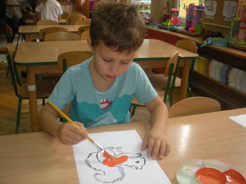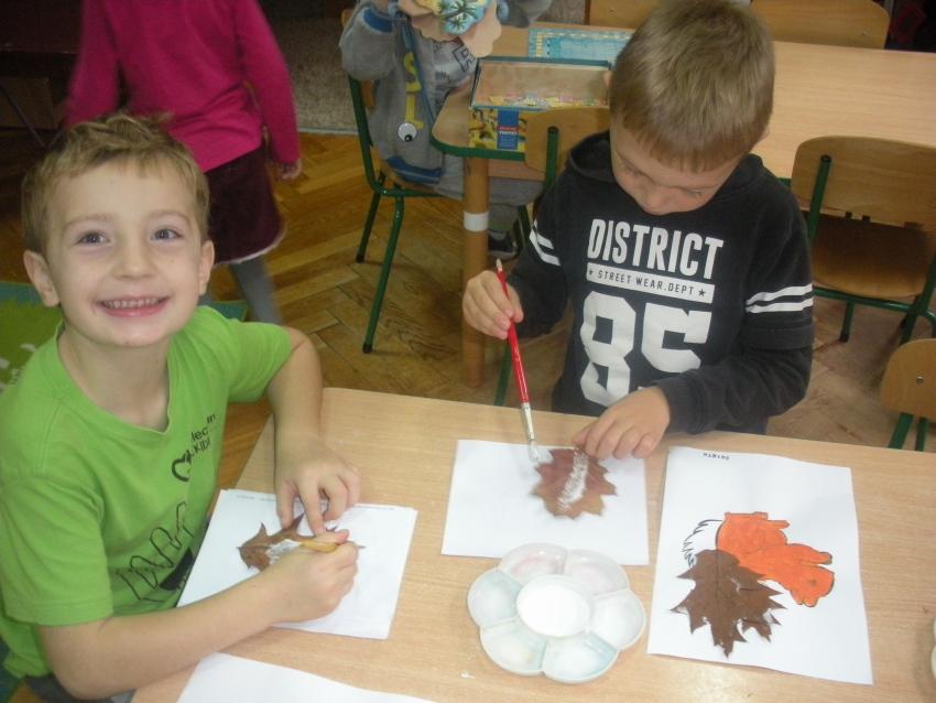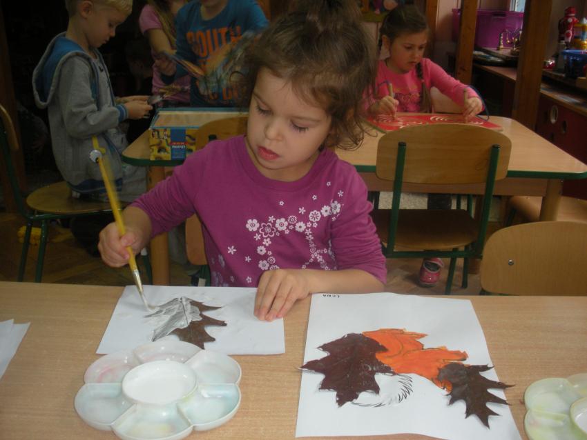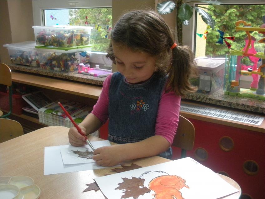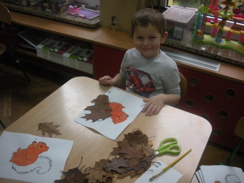 Gumisie uwielbiają wiewiórki - tym bardziej, że kilka z nich zamieszkuje w przedszkolnym ogrodzie. Przedszkolaki postanowiły wykonać wiewiórkowe kity z jesiennych liści.