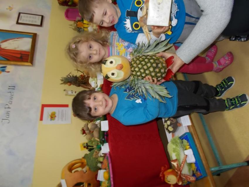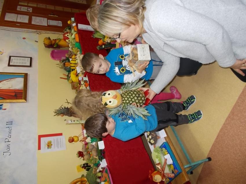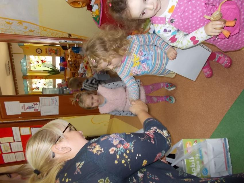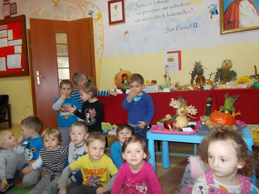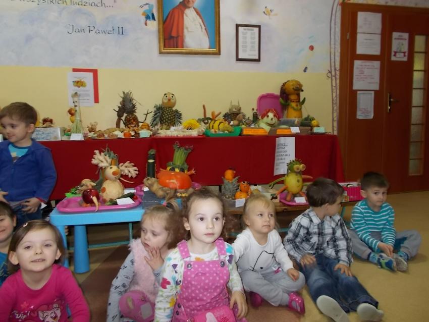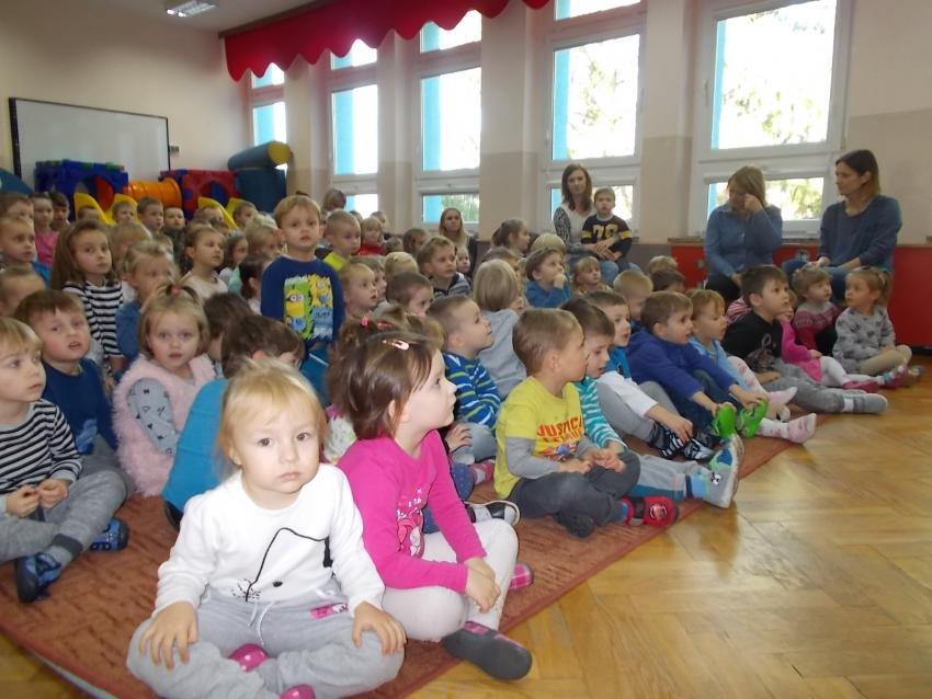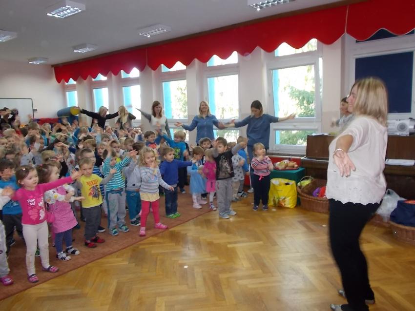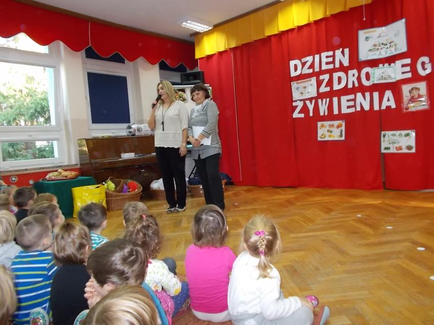 Krasnoludki biorą udział w ogólnoprzedszkolnym spotkaniu na temat zdrowego żywienia.