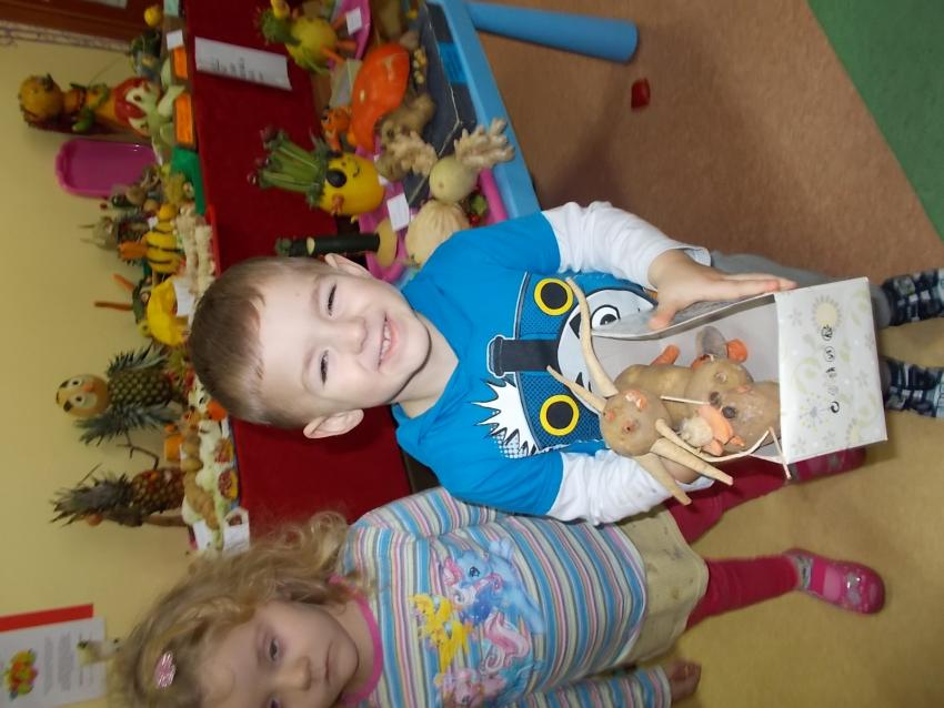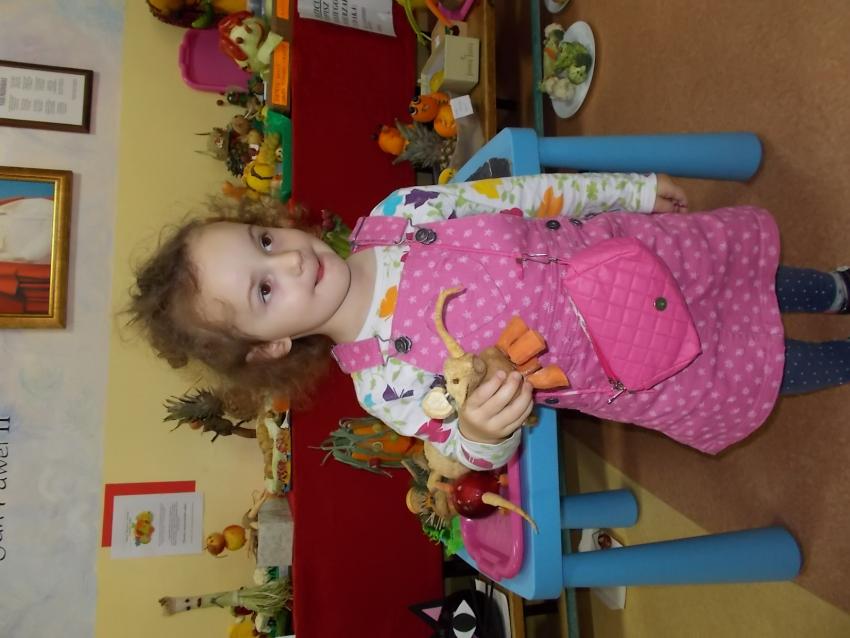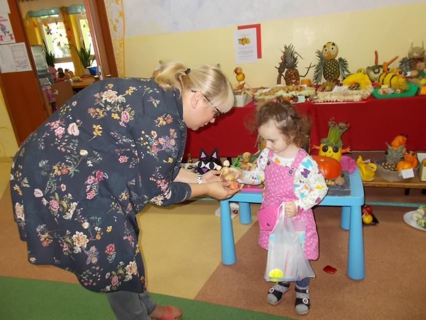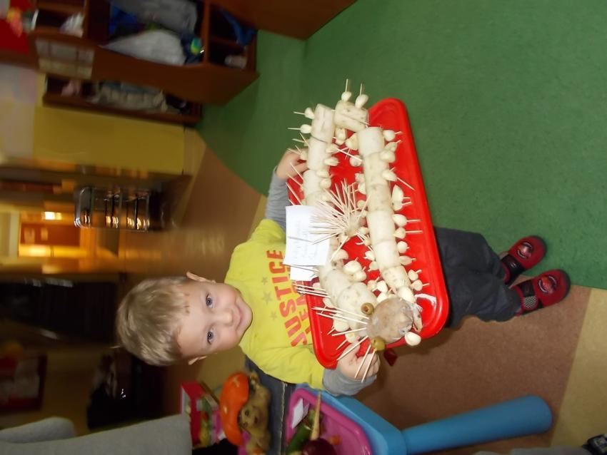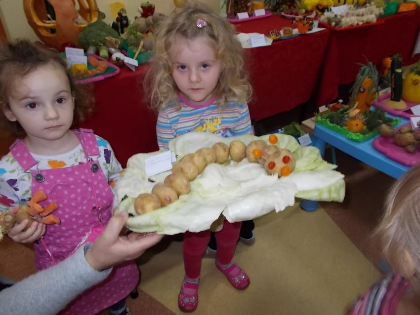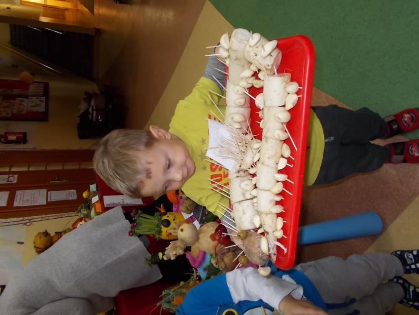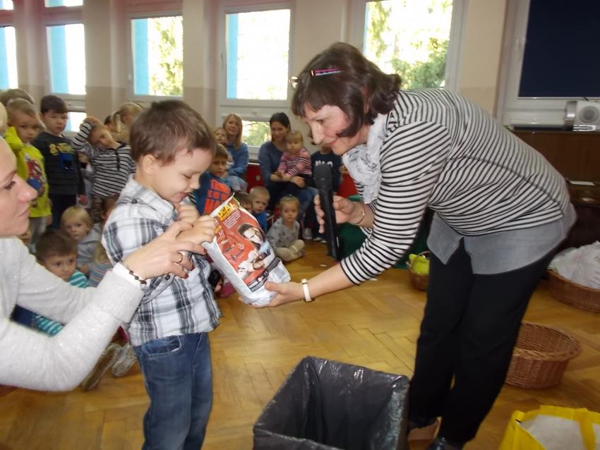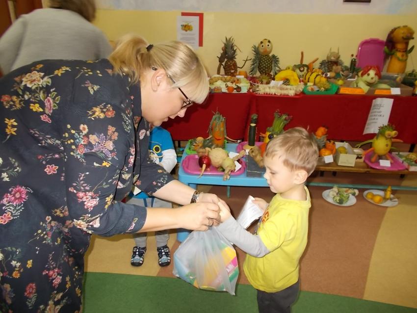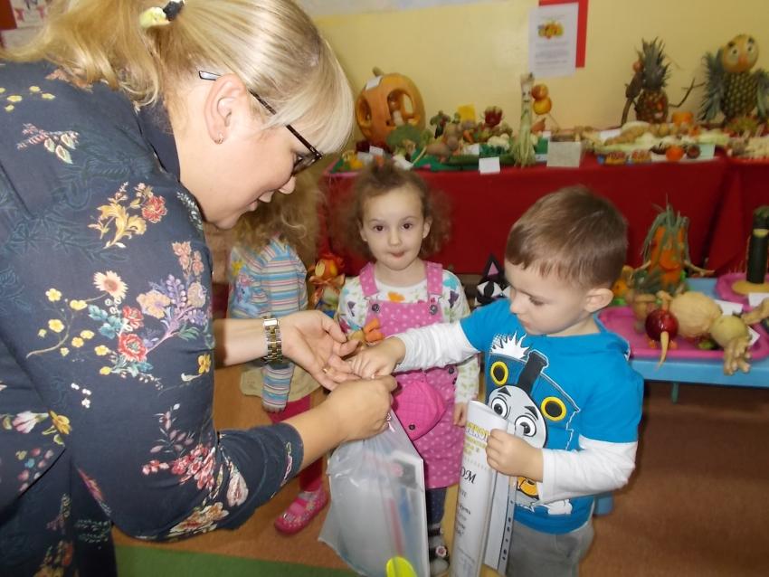 Krasnoludki biorą udział w ogólnoprzedszkolnym spotkaniu na temat zdrowego żywienia.