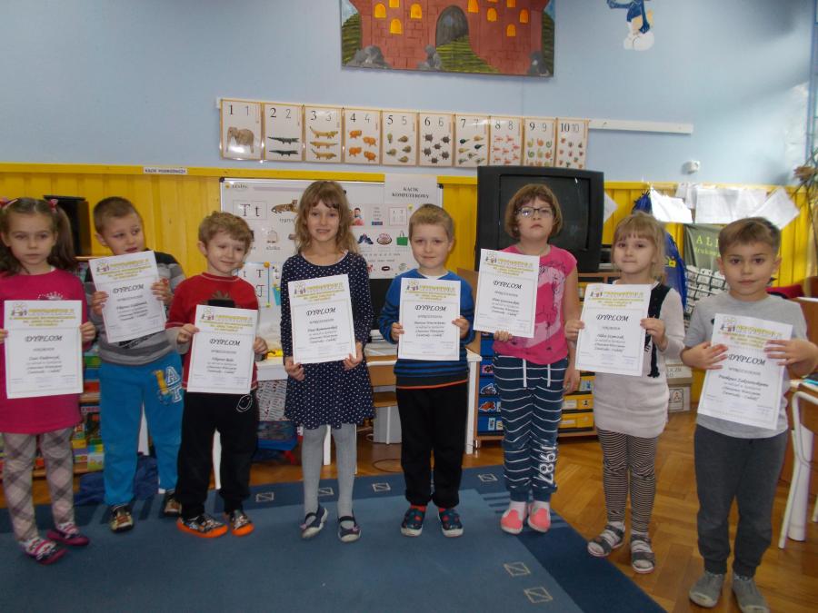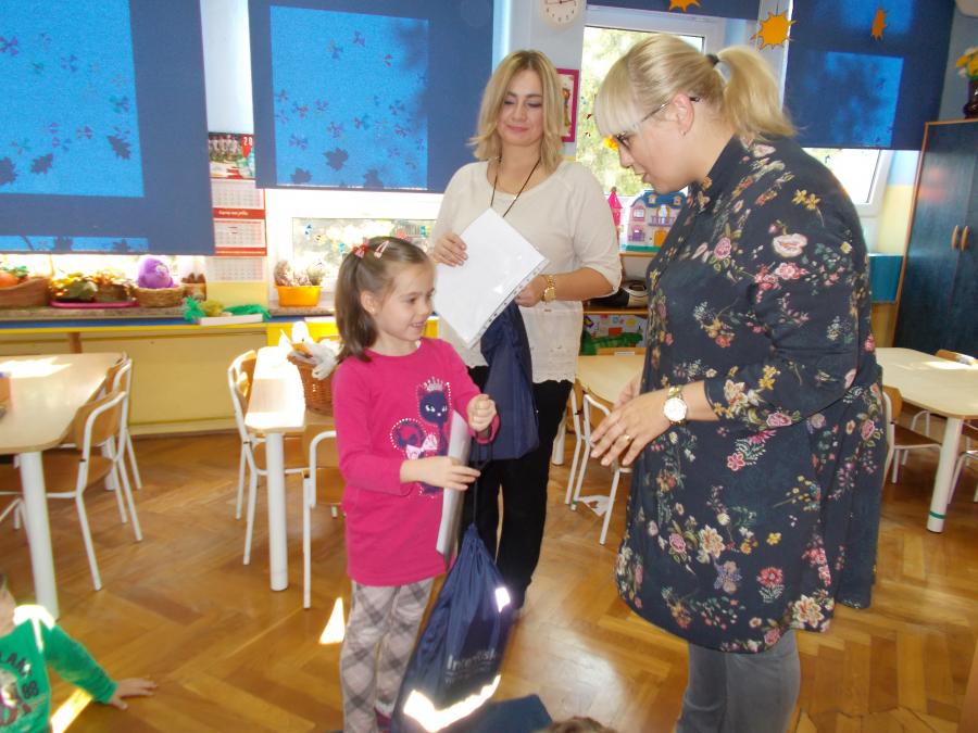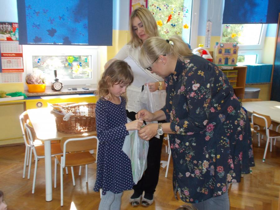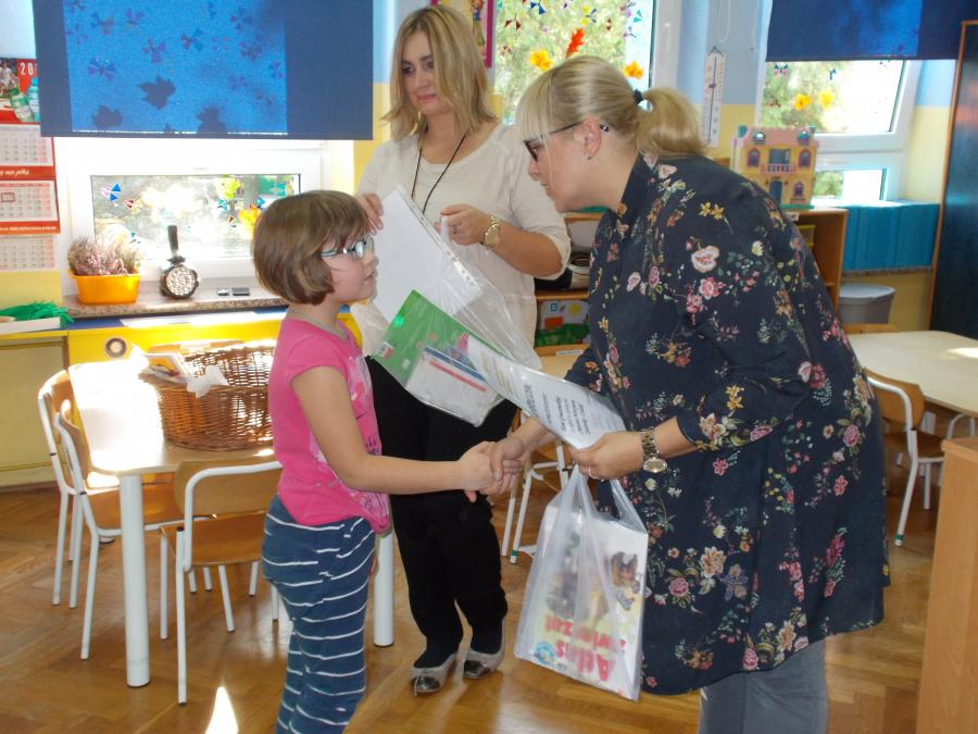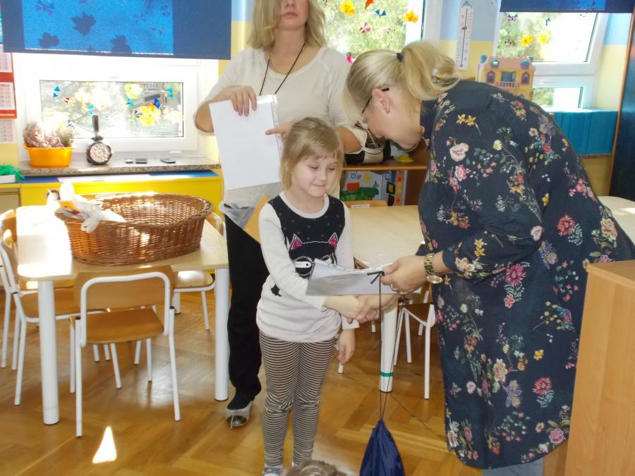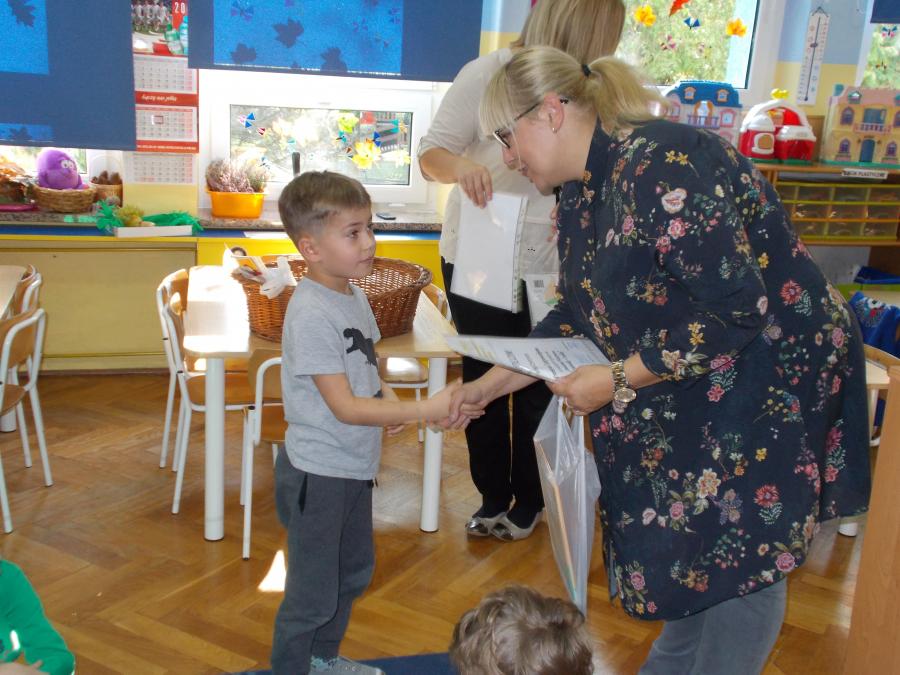 Pani dyrektor Beata Grochowska - Surowiec wręczyła dzieciom nagrody i wyróżnienia za udział w konkursie ,, Warzywno - owocowe zwierzaki - cudaki"
