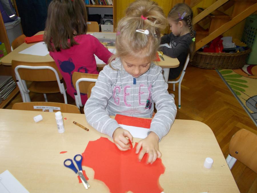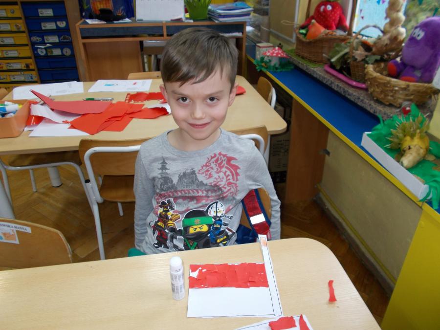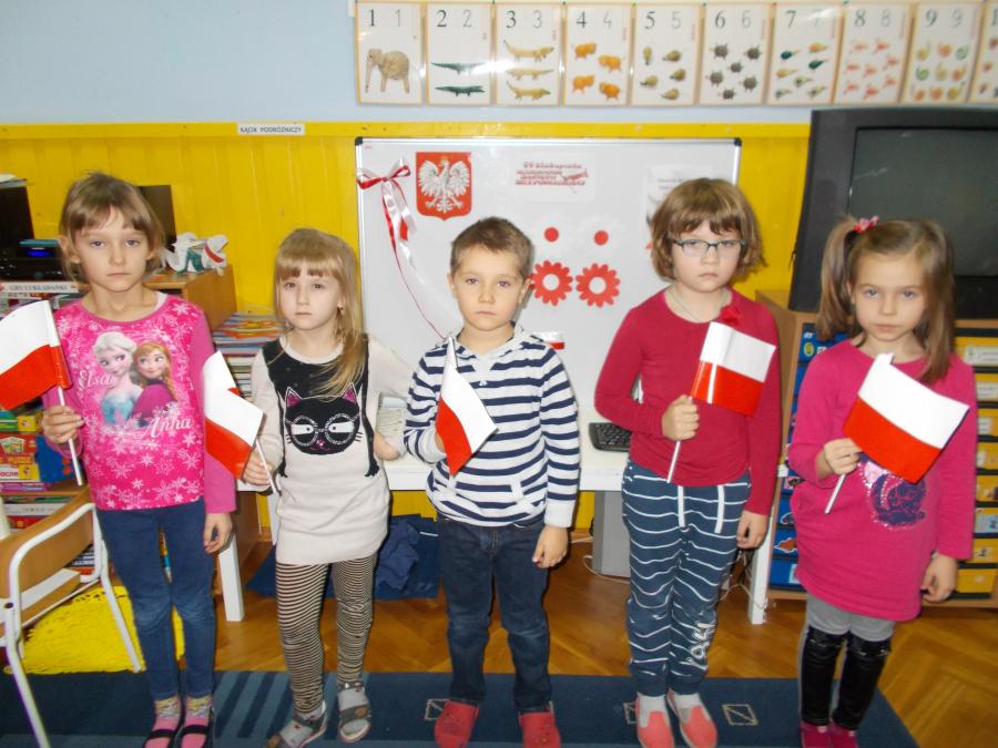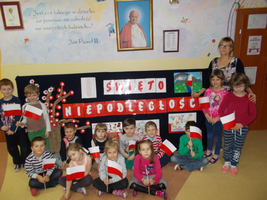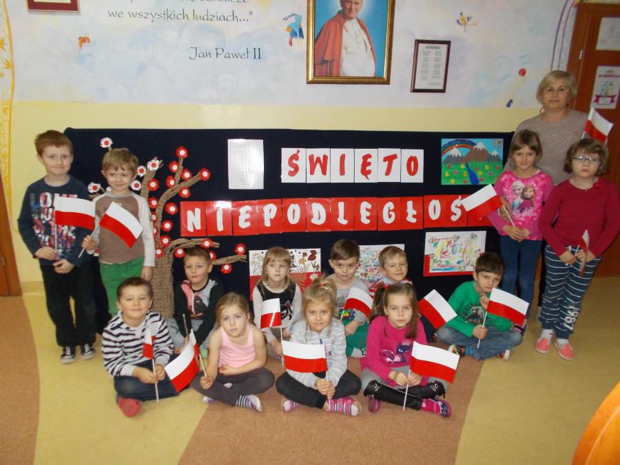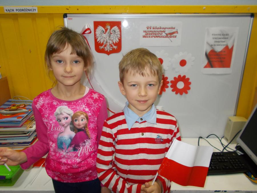 Z okazji zbliżającego się Święta Niepodległości dzieci wykonały biało - czerwone chorągiewki, zaśpiewały hymn państwowy,zapoznały się z postacią Marszałka Józefa Piłsudskiego.