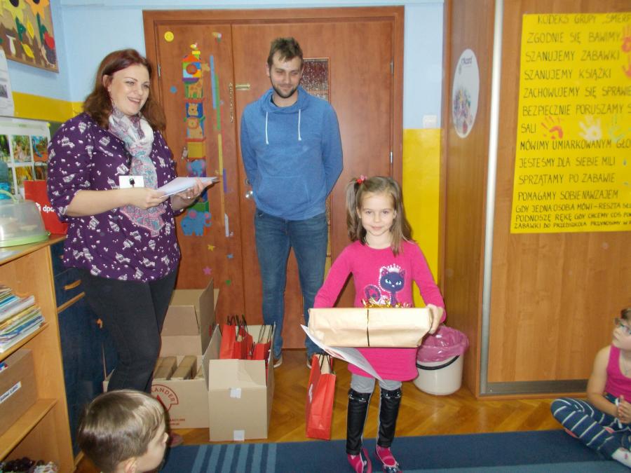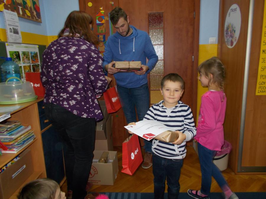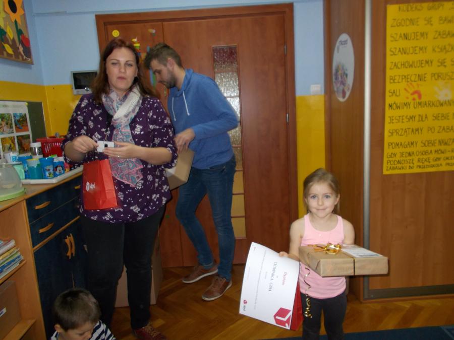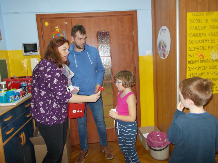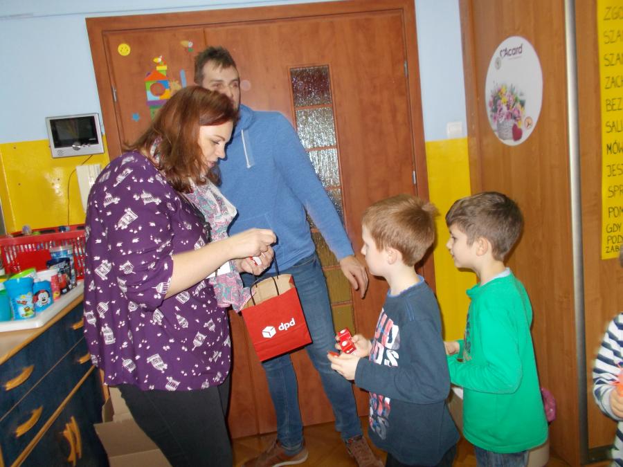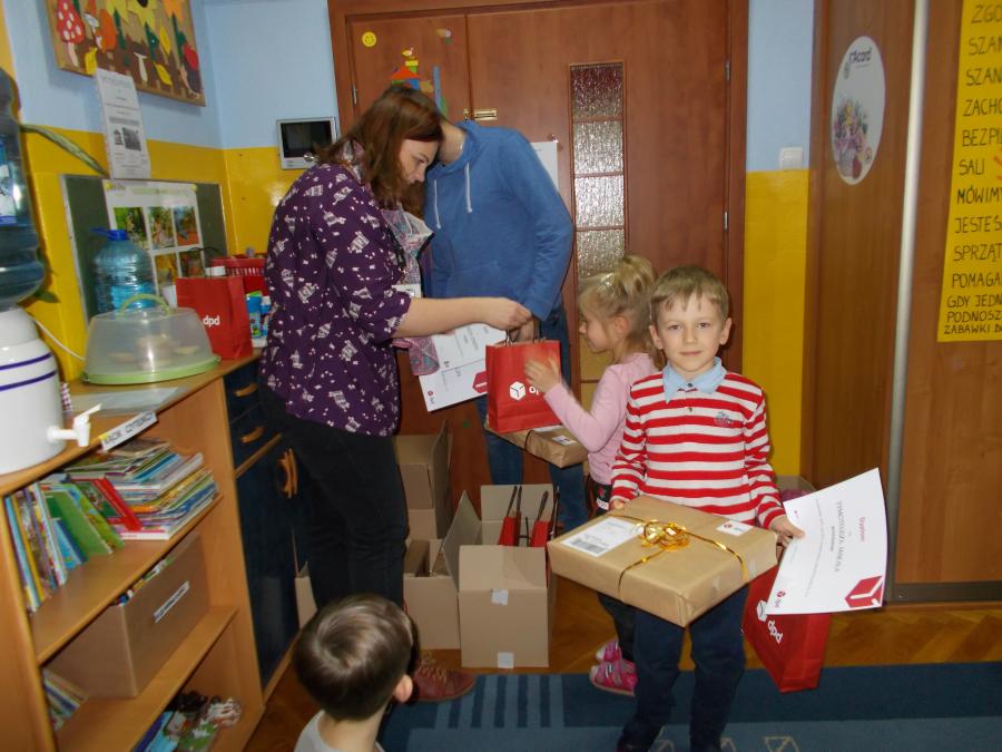 Pani Agnieszka i Pan Tomek z firmy kurierskiej DPD wręczyli dzieciom nagrody za udział w konursie plastycznym pt.: ,,Samochód DPD".