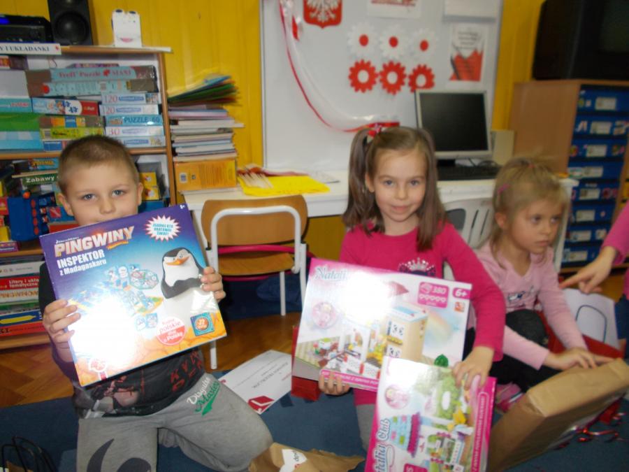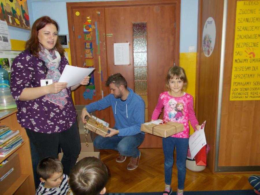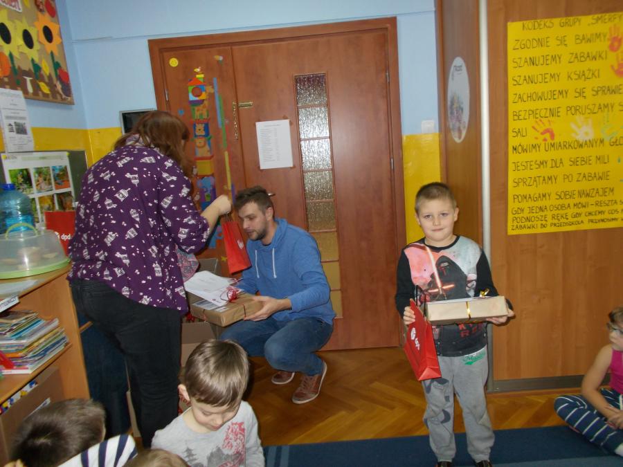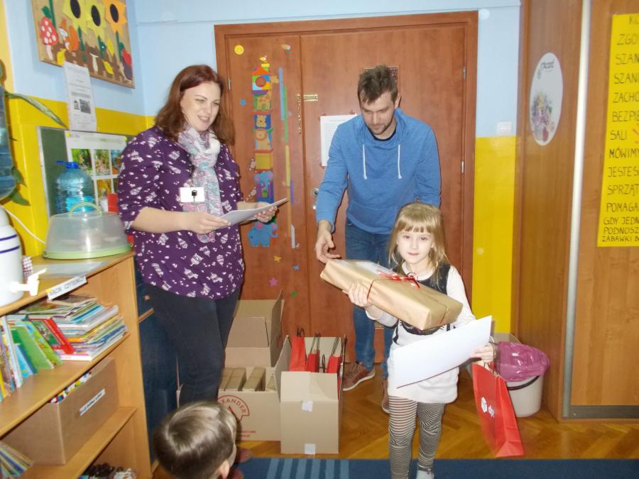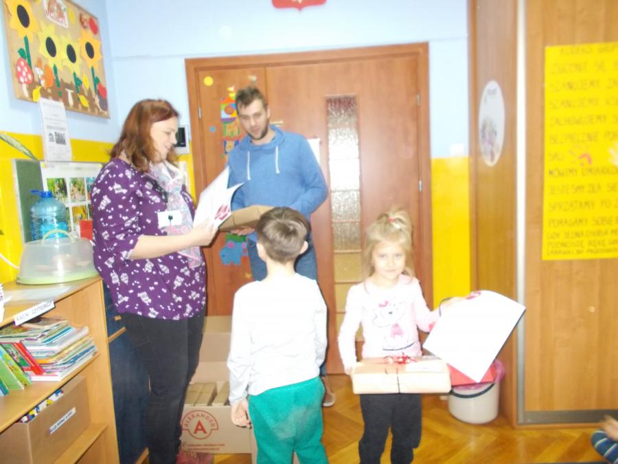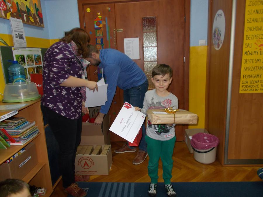 Pani Agnieszka i Pan Tomek z firmy kurierskiej DPD wręczyli dzieciom nagrody za udział w konursie plastycznym pt.: ,,Samochód DPD".