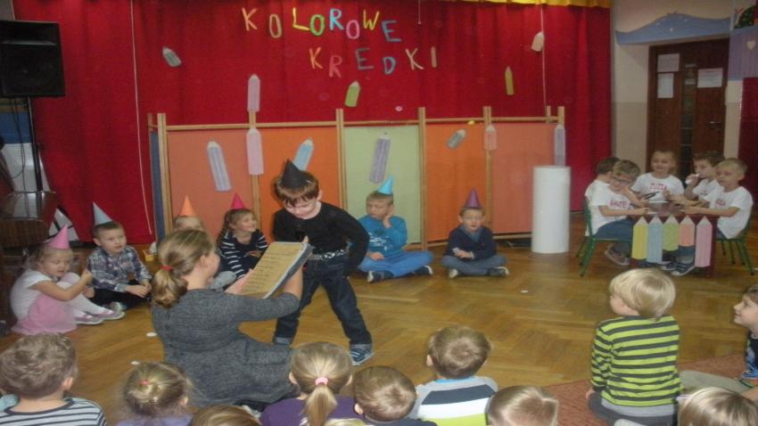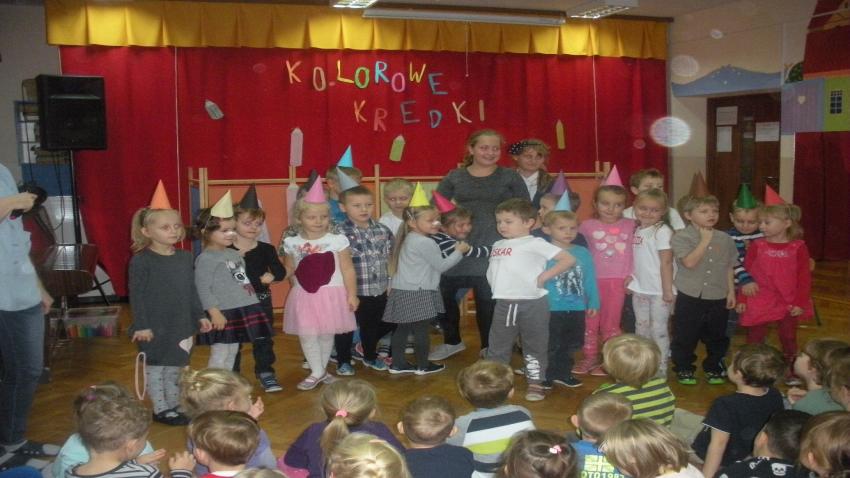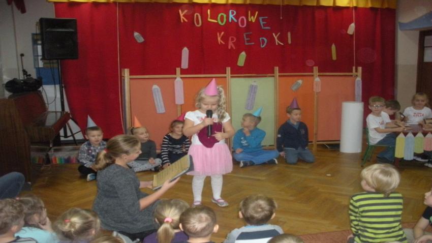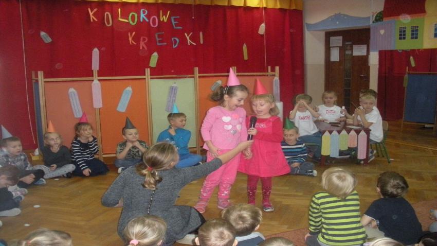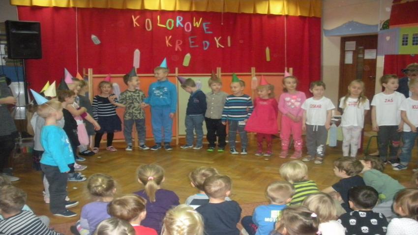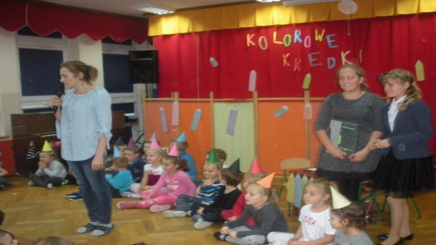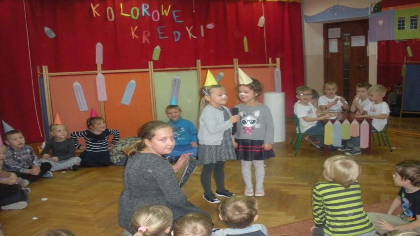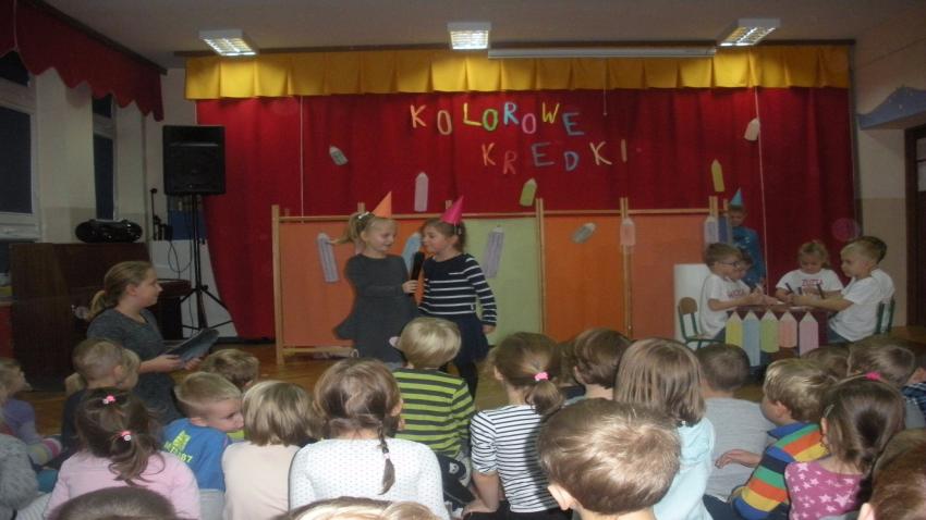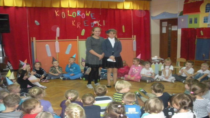 Dzisiaj w naszym przedszkolu wolontariuszki z klasy VB - Ania i Zuzia zorganizowały całej społeczności przedszkolnej niespodziankę. Dziewczęta przygotowały dzieci z grupy Gumisie do występu i zaprezentowały inscenizację pt. "Zmartwienie kredek". To pierwsze tego typu przedstawienie w ramach współpracy przedszkola z pobliską szkołą podstawową.