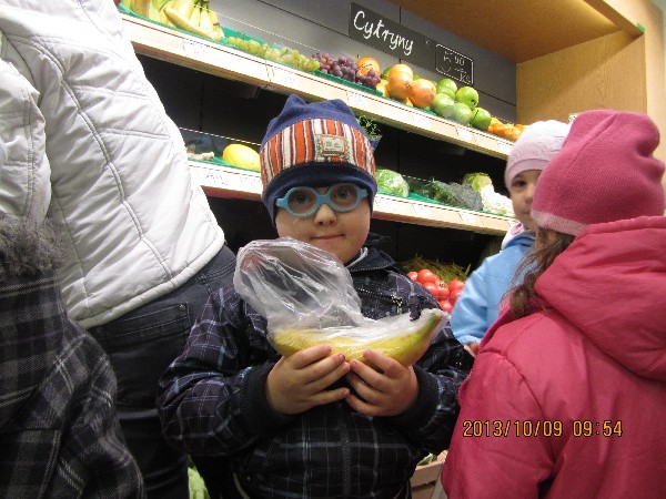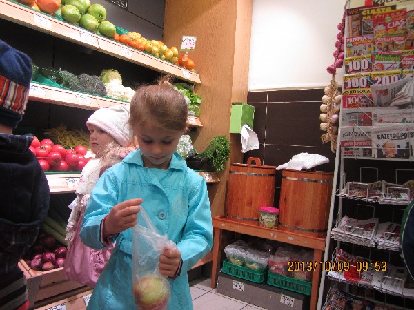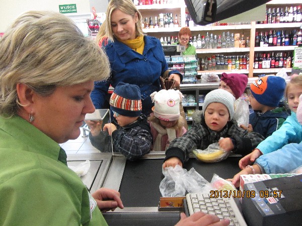 Dnia 9 października 2013 r. w związku omawianą tematyką zajęć dzieci odbyły ciekawą wycieczkę do sklepu spożywczego w Supraślu. Celem wycieczki było zapoznanie przedszkolaków z pracą ekspedientki, towarami znajdującymi się w sklepie oraz zakup owoców.