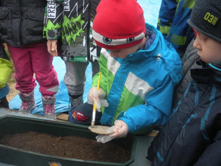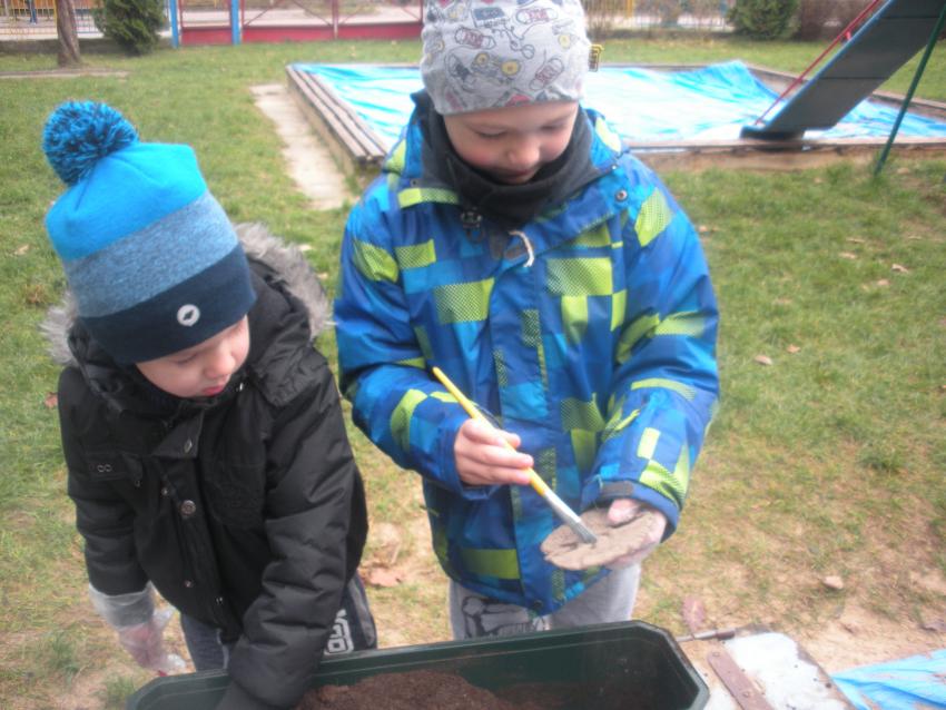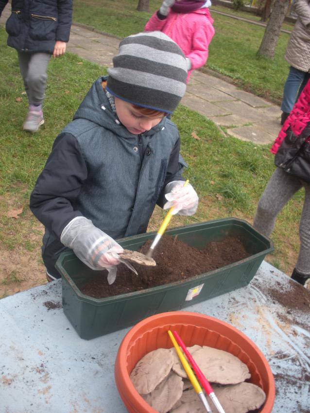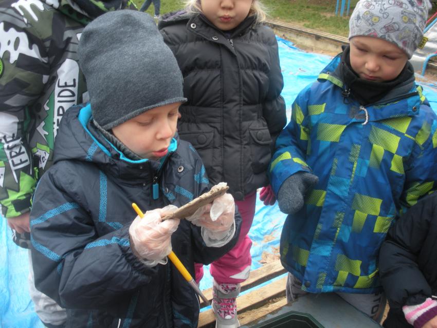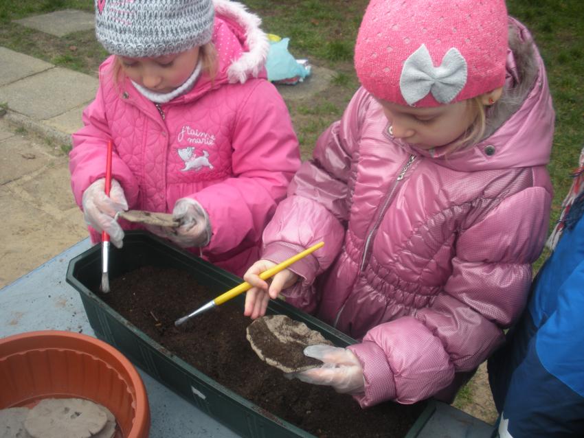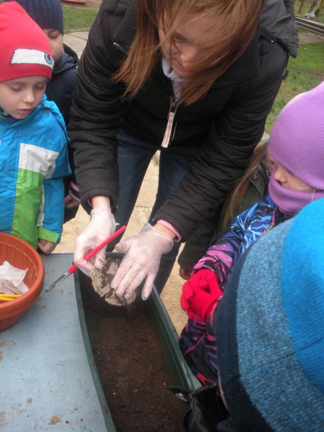 Dzieci wcieliły się w role archeologów i odkrywały w ziemi wykonane wcześniej skamieliny. Dzięki tego rodzaju zabawie, Gumisie zapoznały się z niektórymi zasadami pracy wykopaliskowej.