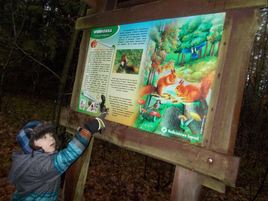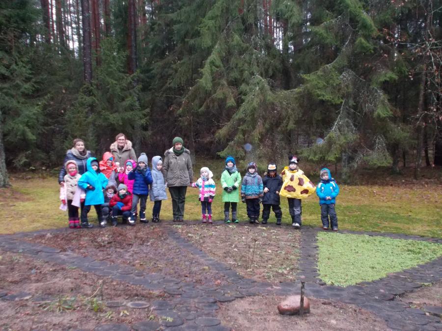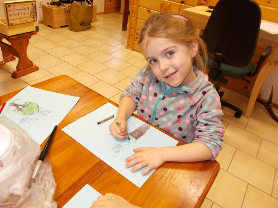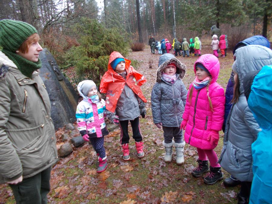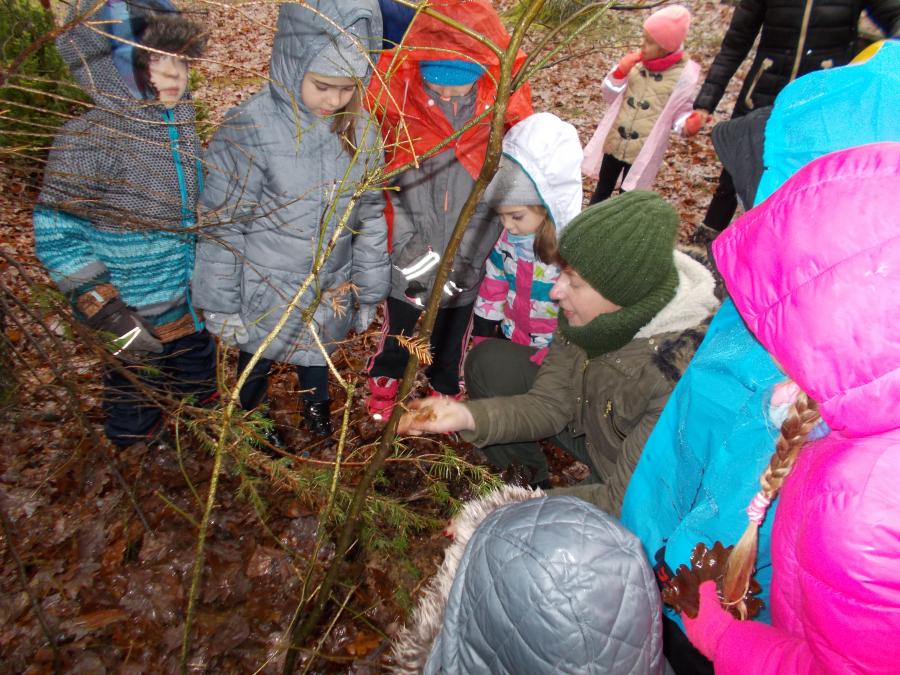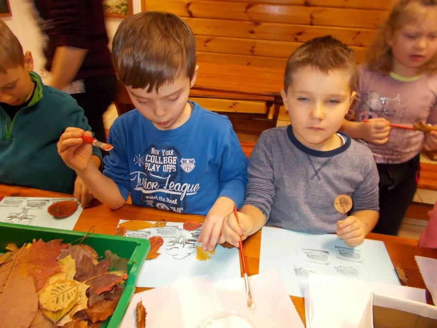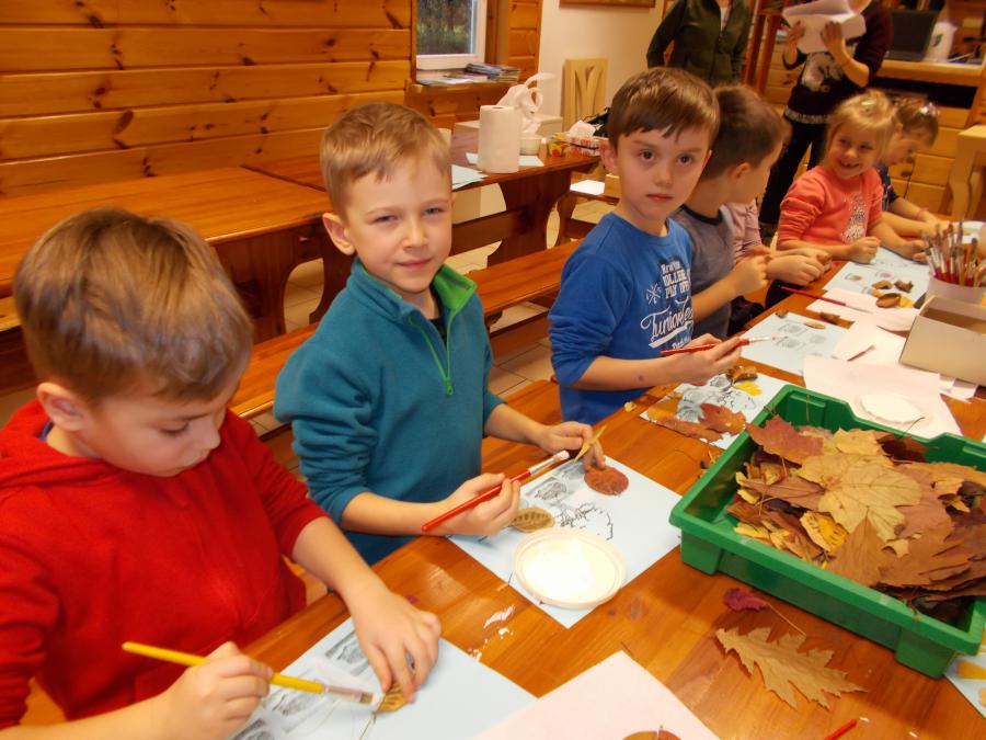 Temat spotkania: ,,Tajemnicze życie leśnych zwierząt". Przedszkolaki rozpoznawały i nazywały zwierzęta leśne, słuchały ciekawostek, które opowiadała Pani leśnik Joanna Rybij, interesowały się, w jaki sposów niektóre leśne zwierzęta przygotowują się do zimy. Bardzo ciekawą pracę plastyczną wykonały Smerfy pt.; ,,Zwierzęta leśne" wykorzystując stemple, liście i kredki.
