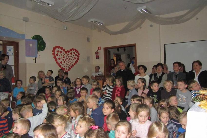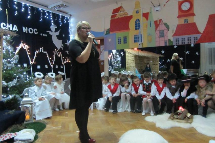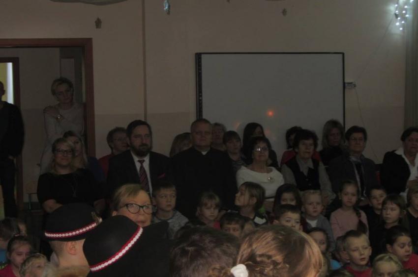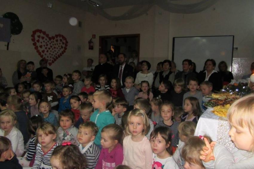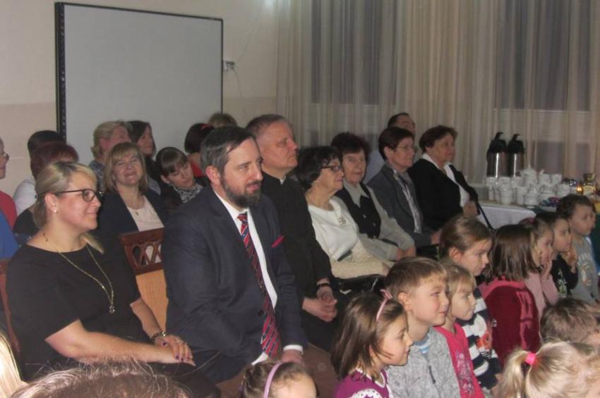 6 latków z grupy " Smerfy", przy akompaniamencie naszej rytmiczki pani Renaty Zbierajewskiej. Na uroczystość przybyli zaproszeni goście, których przywitała pani Dyrektor Beata Grochowska-Surowiec: Burmistrz Supraśla pan Radosłąw Dobrowolski,pani Agnieszka Kamieńska Dyrektor Zespołu Szkolno-Przedszkolnego w Ogrodniczkach, ks.Andrzej Chutkowski,pan Piotr Nierodzik, byli pracownicy naszego Przedszkola, oraz personel i nasze przedszkolaki.