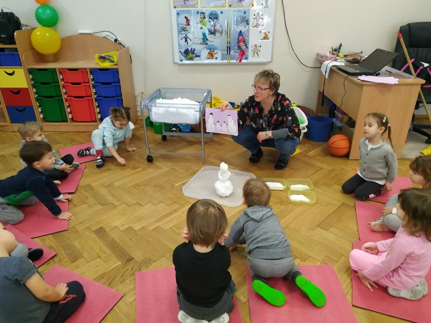Tematem minionego tygodnia były zimowe mistrzostwa sportowe. Dzieci były zachęcane do różnego rodzaju aktywności na świeżym powietrzu zimą. Poznały nazwy zimowych dyscyplin i sprzętu sportowego (sanki, narty, łyżwy). Przypomnieliśmy sobie, jak należy być ubranym podczas zabaw na śniegu. Rozmawialiśmy o zasadach bezpieczeństwa podczas zabaw zimowych, o tym, jakie zabawy są bezpieczne, a jakie nie, i jak we właściwy sposób korzystać ze sprzętu sportowego. Bawiliśmy się – na świeżym powietrzu i w przedszkolu – w zabawy związane ze śniegiem. Nawet w naszej sali ulepiliśmy prawdziwego bałwana, który był obiektem naszych obserwacji. Na naszych oczach bałwanek zamienił się w wodę i przypuszczaliśmy, że gdy wodę wystawimy na mróz, to z niej znowu zrobi się bałwanek. Niestety w wiaderku z wodą znaleźliśmy jedynie lód a nie naszego bałwanka. Jeszcze długo będziemy rozwijać umiejętności wnioskowania i logicznego myślenia. Przy okazji lepienia bałwanka poznaliśmy dwa pojęcia: koło i kula. Zastanawialiśmy się, jak poruszałyby się samochody, gdyby zamiast kół miały kule. Układaliśmy kule wg wielkości, uzasadniając - dlaczego bałwanki lepi się poczynając od największej kuli.