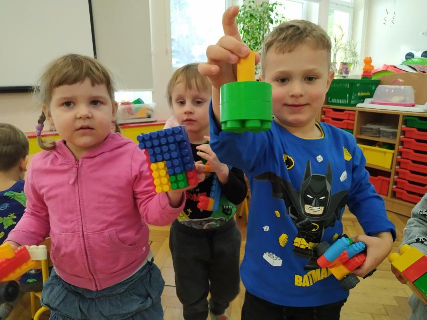 W minionym tygodniu jakby na nowo odkrywaliśmy świat przez pryzmat wynalazków. Oczywiście zaczęliśmy od zrozumienia pojęcia „wynalazek”, co nie było wcale takie proste. Nie wiedzieliśmy np. czy wynalazkiem jest koń czy dorożka. Z pomocą przyszła nam myszka z bajki, która wymyśliła sposób na podlewanie kwiatów. Potem rozmawialiśmy o wynalazkach tych dużych, umożliwiających loty w kosmos, i tych małych - niemalże niezauważalnych, takich jak: łyżka, kubek, żarówka czy dozownik do mydła. Przy okazji poznaliśmy różne środki transportu, oczywiście wymyślone przez człowieka. Spróbowaliśmy też własnych sił twórczych poprzez konstruowanie z klocków pożytecznych maszyn. I tak powstały maszyny: do zcinania, łupania drzewa, do kręgli, do lodów, do dmuchania balonów, do fajerwerków, do sypania piaskiem, do robienia śniegu.