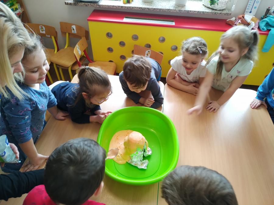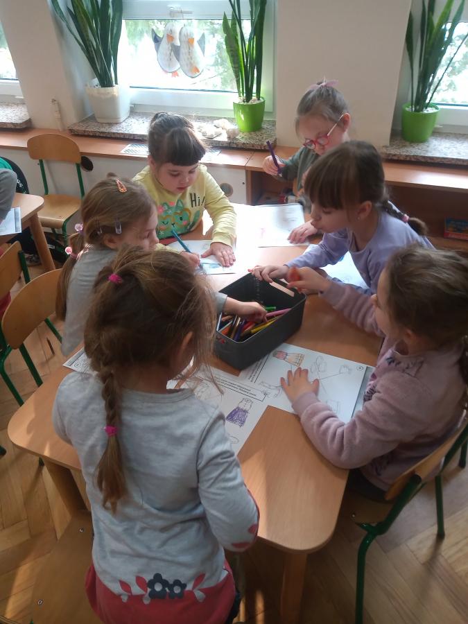 Tematem minionego tygodnia była marcowa pogoda. Dzieci poznały przysłowie W marcu jak w garncu i dowiedziały się, co ono oznacza. Zajączki przypominały sobie nazwy zjawisk atmosferycznych, takich jak: deszcz, wiatr, słońce, śnieg, chmury, burza oraz poznawały oznaczające je symbole graficzne. Gotując „marcową zupę pogodową” wg przepisów proponowanych przez nauczycielkę, doszły do perfekcji - przyrządzając zupę wg własnego pomysłu. I tak – jedni preferowali zupę ostrzejszą z większą ilością piorunów, inni woleli łagodniejszą z dużą dawką słoneczka a jeszcze inni zamiast kminku dosypywali większe ilości wiatru :). Do zabaw w pogodę wykorzystaliśmy nie tylko tzw. kodowanie na dywanie ale również zabawy muzyczno-graficzne i ruchowe z wykorzystaniem piosenki „Deszczyk pada, wieje wiatr”, nagrań odgłosów przyrody oraz instrumentów muzycznych naśladujących dźwięki z otoczenia przyrodniczego (talerze, kij deszczowy, keyboard). W poszukiwaniu zjawisk atmosferycznych ruszyliśmy również w teren. Podczas spaceru oglądaliśmy niebo, obserwowaliśmy i opisywaliśmy pogodę. Słoneczko (a właściwie emotikon w kształcie słoneczka) zachęciło nas również do rozmowy o emocjach i wyrażaniu ich mimiką twarzy a przy pomocy lusterek ćwiczyliśmy tę umiejętność w praktyce. Naszą sympatię do jubilatki – Karolinki wyraziliśmy nie tylko życzeniami ale także pięknym uśmiechem.