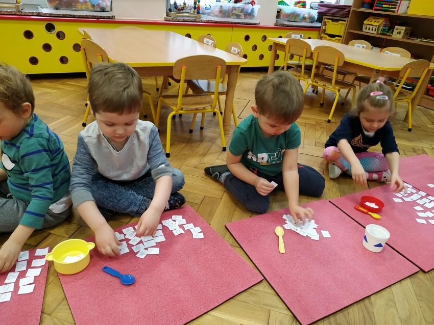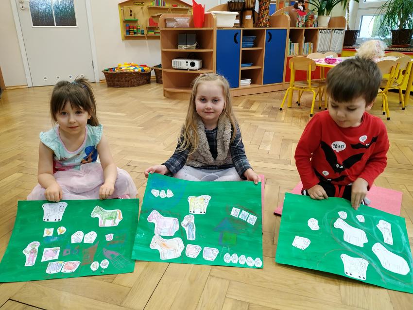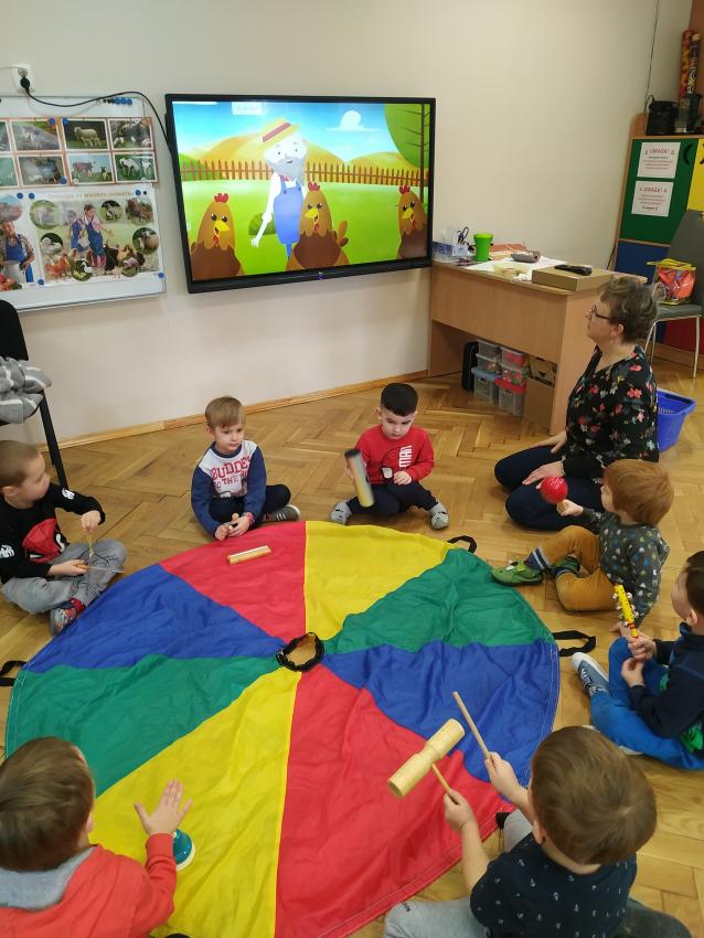 Przy piosence „Trzy kurki” wcielaliśmy się w rolę kurek, które wyszły w pole w poszukiwaniu ziaren. Przy okazji - zupełnie nieświadomie liczyliśmy i uczyliśmy się liczebników głównych i porządkowych w zakresie 6.