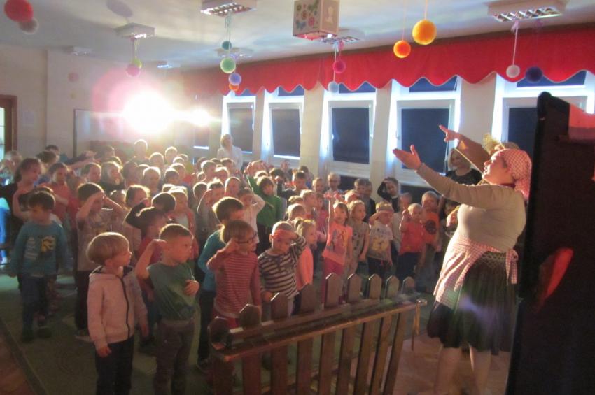 Poźniej byliśmy na przedstawieniu pt. "Szewczyk Dratewka" w Domu Ludowym, a na koniec był mini-piknik na przedszkolnym palacu zabaw.