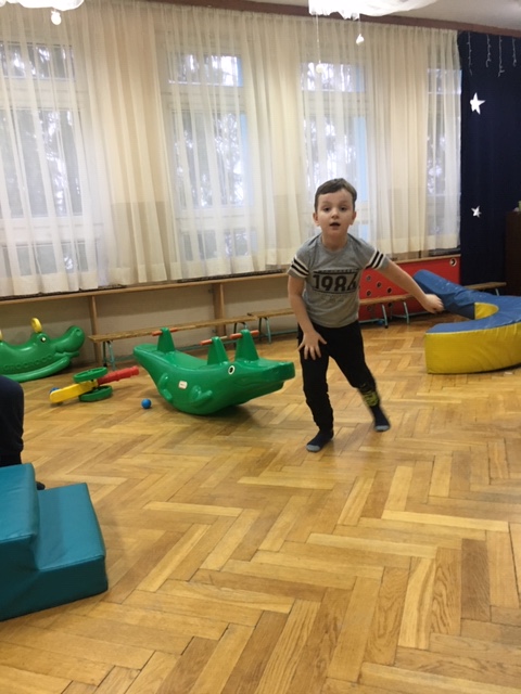 Pszczółki uwielbiają ruch! Na sali gimnastycznej również. Tym razem zorganizowały skoki do basenu. Wzorując się na skokach narciarskich, był nawet sędzia, który zezwalał na skok. Zabawa była udana!!!