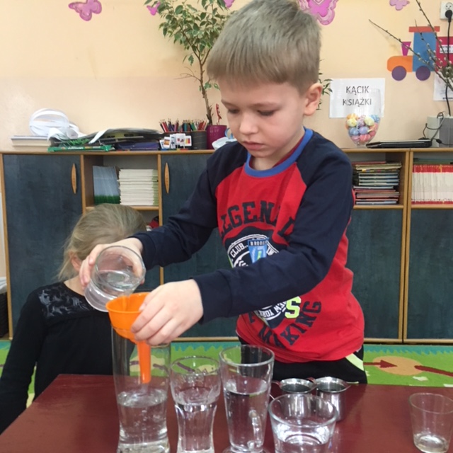 Dzieci z grupy "Gumisie" badają objętość wody wykorzystując różne naczynia.
