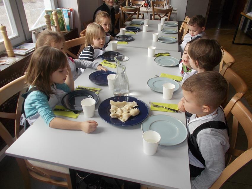 Dziś "pszczółki" wybrały się na wasztaty do restauracji "Prowincja" w Supraślu. Dzieci z zainteresowaniem słuchały jak się robi pierogi a także same mogły to zrobić. Na koniec zjadły zrobione przez siebie pyszne pierogi i otrzymały dyplomy :)