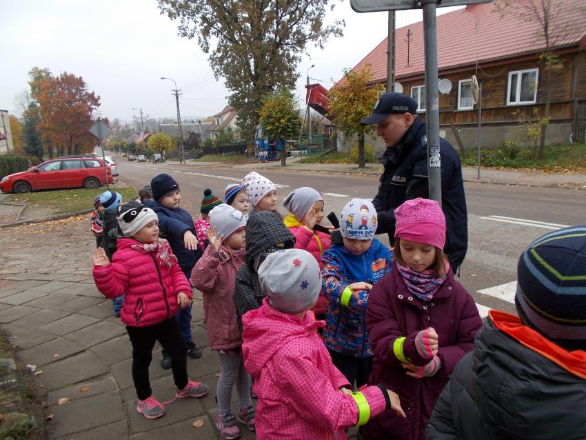 Pod czujnym okiem pana policjanta przedszkolaki doskonalą bezpieczne zachowania na jezdni i chodniku. Gumisie wiedzą, co należy zrobić, aby przejść na drugą stronę jezdni. Wiedzą też, jak wielkie znaczenie mają elementy odblaskowe - dziś dostały od pana policjanta opaski odblaskowe w prezencie.
