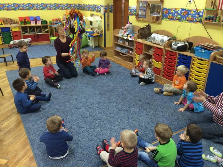 Nasze najmłodsze przedszkolaki z dwóch grup - Krasnoludki i Muminki - wesoło i ochoczo uczestniczą w zajęciach rytmicznych z elementami tańca ludowego. Pani Ela odwiedza ich i zachęca do tańca z "dziwnym" gościem . To Lajkonik!!!!!!!!, który uwielbia się bawić wspólnie z dziećmi.