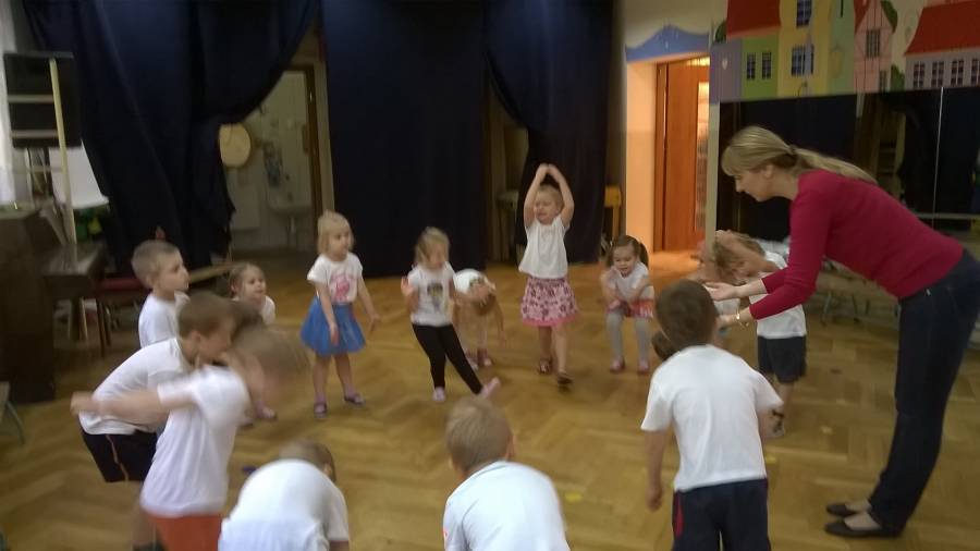 Potrafimy się wesoło bawić, ale również ćwiczyć z ochotą na zajęciach ruchowych. Pani Madzia wymyśla nam fajne zabawy, pokazuje różne ćwiczenia! Nawet czasami, na zakończenie zajęć, nasze panie bawią się z nami w berka!