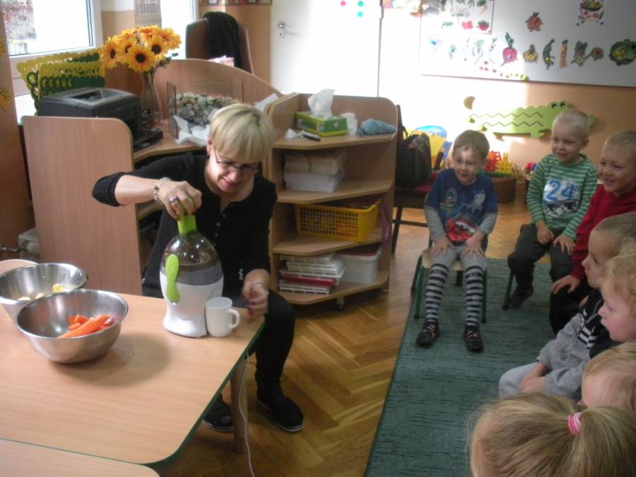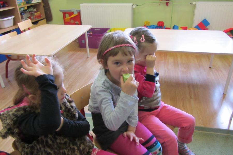 Jesień zawitała również do grupy Elfów - dzieci przynosiły różne owoce i warzywa - dary jesieni, o których rozmawiały, a na koniec ochoczo smakowały zdrowe witaminki. Jadły nawet cytrynę - egzotyczny owoc - a przy tym miały uśmiechniętą minę. Można powiedzieć - To nie Elfy, a prawdziwe Zuchy!!!!