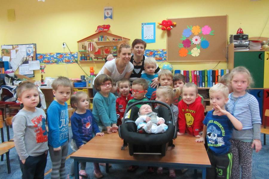 Grupę Krasnoludków odwiedziła p. Marysia wraz ze swoim malutkim synkiem Jasiem, braciszkiem Mateusza. Maluchy chętnie i z zainteresowaniem słuchały jak należy opiekować się młodszym rodzeństwem.