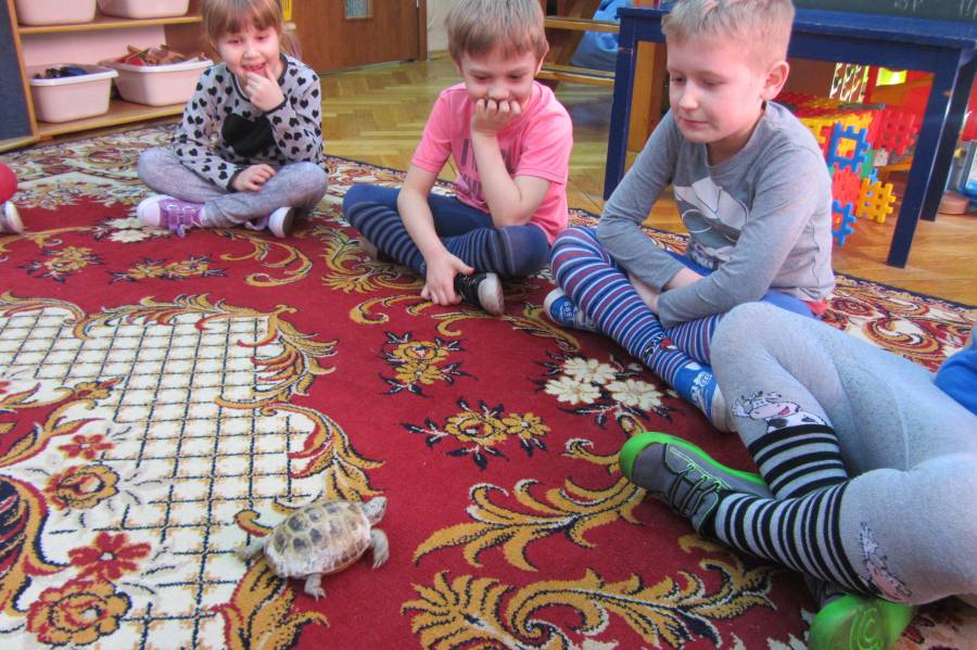Pewnego, wiosennego dnia, kiedy słoneczko świeciło nad lasem...... do grupy Gumisiów zawitał GOŚĆ. Był nim mały żółw, którym na co dzień opiekują się bracia - Karol i Piotr. Żółwik czuł się swobodnie w nowym miejscu co pokazał również najmłodszej grupie - Krasnoludkom - którzy tego dnia nas odwiedzili. Przedszkolaki poznały różne ciekawostki z życia żółwia. Dowiedziały się również co znaczy "wziąć odpowiedzialność za innych".
