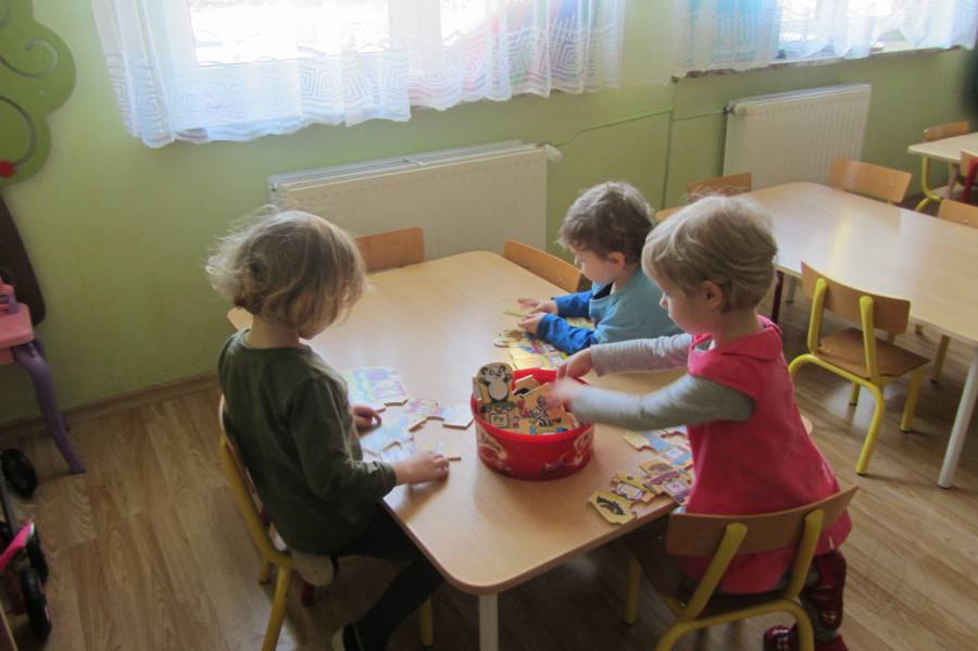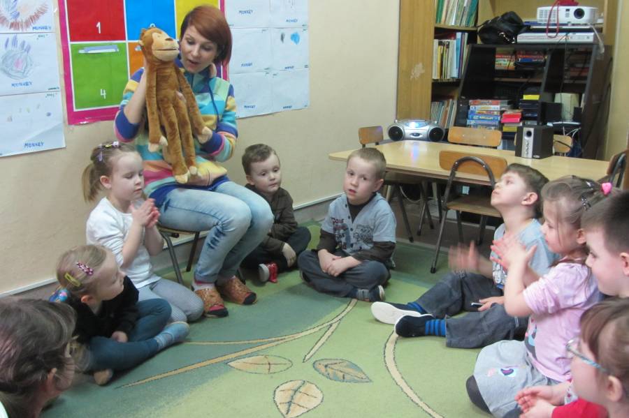 Dzieci posiadają naturalną ciekawość świata i chęć do nauki, co warto wykorzystać. Wczesne nauczanie języka angielskiego zgodne jest z ogólnoeuropejskimi tendencjami obniżania wieku rozpoczęcia nauki języka obcego. Nauczyciel uczący małe dzieci powinien pamiętać o zabawowej formie pracy oraz o kręgu zainteresowań dziecka. Pierwsze lata nauki języka angielskiego powinny być dla dziecka przede wszystkim przyjemnością. Kiedy przychodzimy na zajęcia z panią Karoliną wesoło się bawimy śpiewając piosenki, poznając kolejnych gości - pacynki, którzy nas odwiedzają. Z niecierpliwością czekamy na następne zajęcia!!!